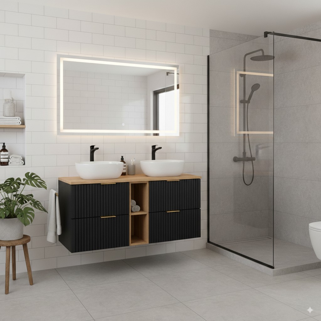 Avec ses façades noir mat associées au chêne wotan, cet ensemble NOXERA séduit par son style contemporain et ses finitions contrastées. Son design épuré apporte une touche chic et élégante à toutes les salles de bain modernes, tout en intégrant une note naturelle grâce à l’aspect bois.