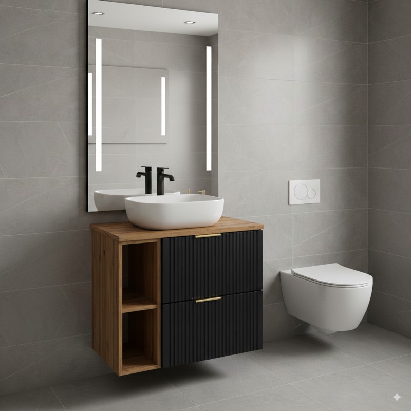 Le meuble sous vasque (60 × 57 × 46 cm) comprend 2 tiroirs spacieux pour vos accessoires et produits de toilette. Les deux niches ouvertes (20 × 57 × 46 cm chacune) apportent un espace pratique pour serviettes ou paniers décoratifs. Le plan pour vasque de 80 cm (80 × 2 × 46 cm) assure confort et praticité au quotidien.