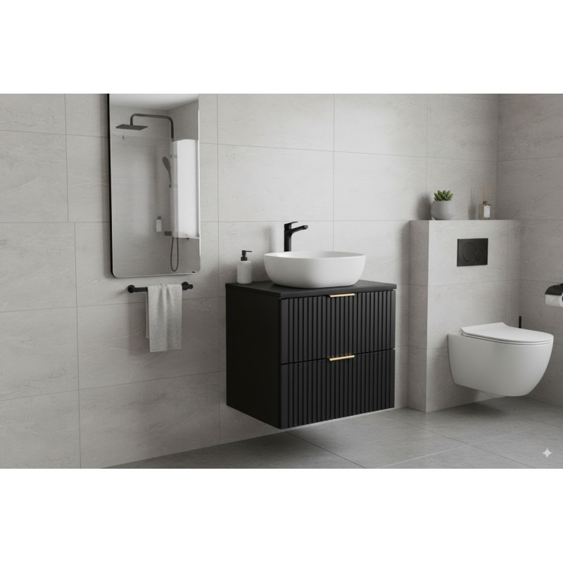 Alliez compacité et design avec le meuble sous vasque NOXERA. Cet ensemble pratique et moderne inclut un meuble de 60 cm équipé de deux tiroirs, un plan pour vasque assorti et une vasque ronde en céramique. Parfait pour les petites salles de bain ou salles d’eau.