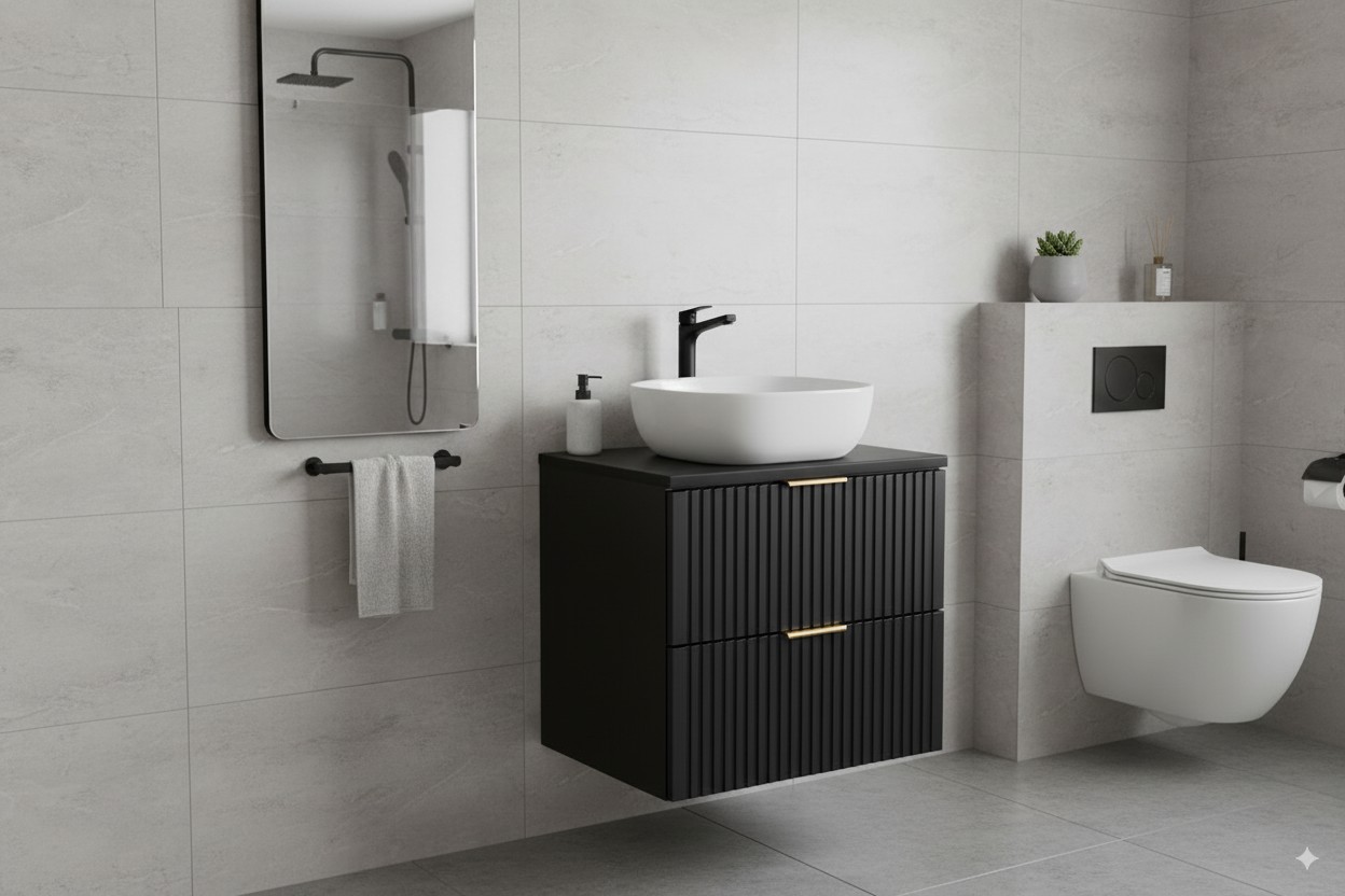 Avec sa finition noir mat sobre et raffinée, ce meuble NOXERA s’intègre facilement dans les intérieurs modernes. Son style minimaliste associé à la vasque en céramique apporte une touche chic et intemporelle à votre espace.