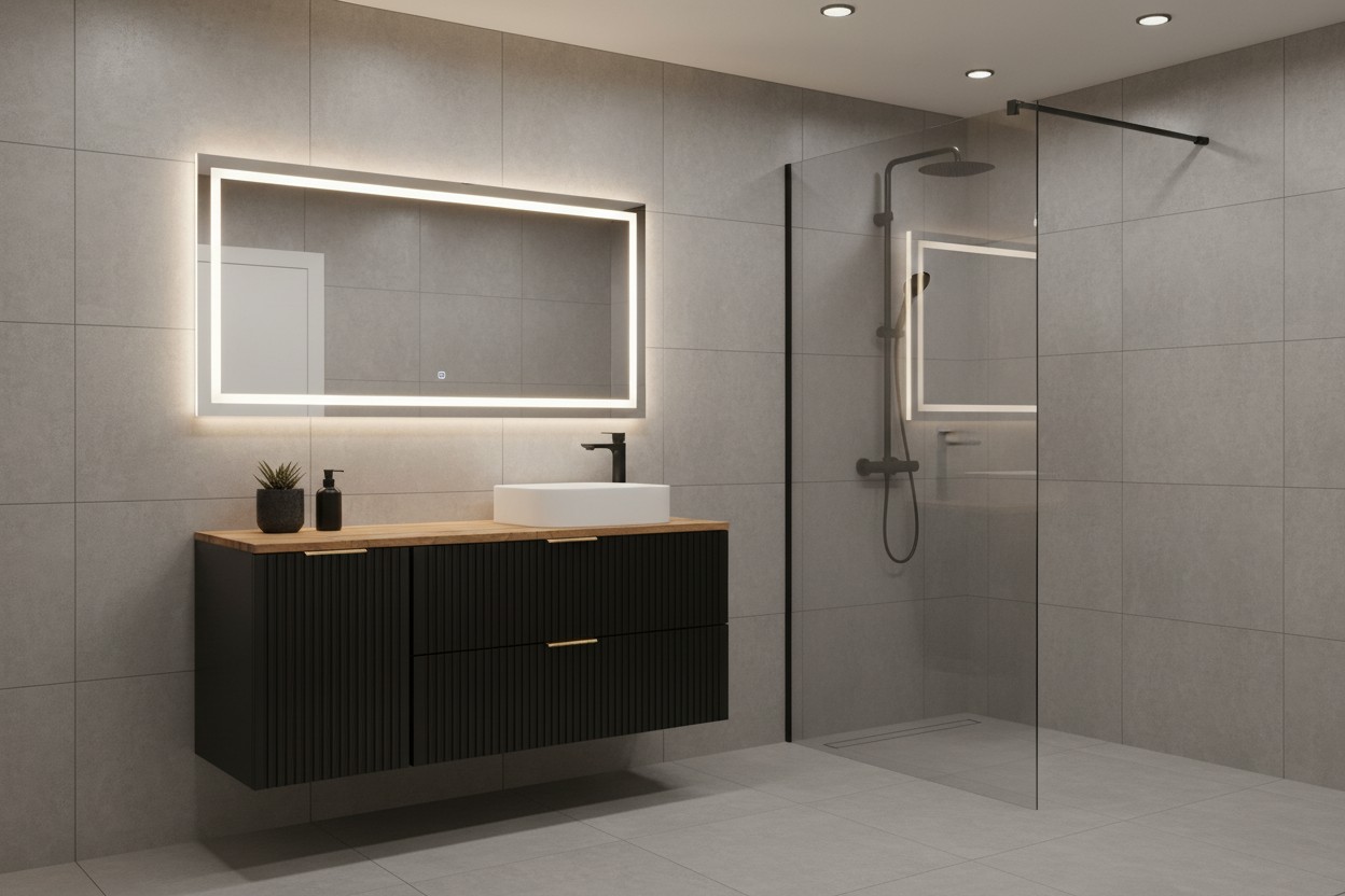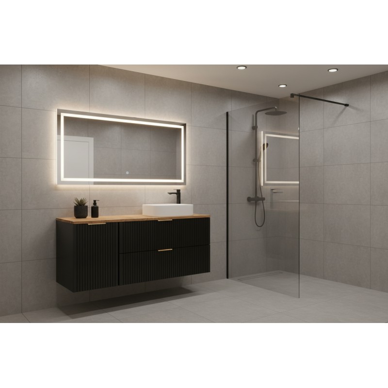 Avec ses façades noir mat et son plan pour vasque en chêne wotan, cet ensemble NOXERA allie modernité et esprit naturel. Le contraste bois et noir mat apporte une touche élégante et intemporelle qui s’intègre facilement dans tous les intérieurs.
