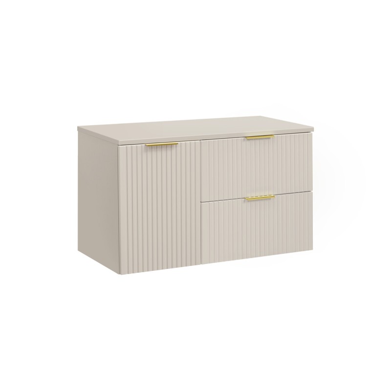 Le meuble se compose d’un module 2 tiroirs (60 × 57 × 46 cm) et d’un module 1 porte (40 × 57 × 46 cm) avec panier à linge intégré, idéal pour gagner de la place et organiser vos affaires. Le plan pour vasque (100 × 2 × 46 cm) complète l’ensemble pour un usage quotidien pratique et élégant.