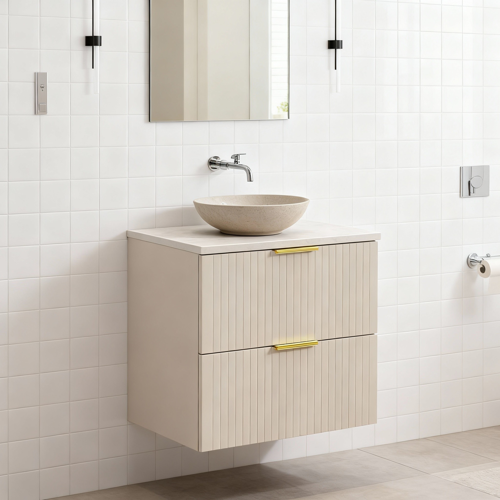 Compact et fonctionnel, l’ensemble de salle de bains NOXERA 60 cm est la solution idéale pour les petites et moyennes salles d’eau. Il comprend un meuble sous vasque avec 2 tiroirs et un plan pour vasque assortie.