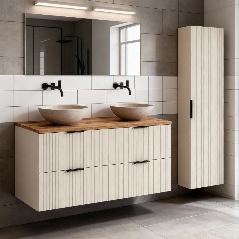 Les meubles sous vasque sont équipés de 2 tiroirs spacieux chacun pour ranger vos serviettes et produits du quotidien. Le plan pour vasque de 120 cm apporte une surface d’utilisation élégante et pratique. La colonne suspendue (35 × 140 × 25 cm) offre un rangement vertical supplémentaire, parfait pour les accessoires et cosmétiques.