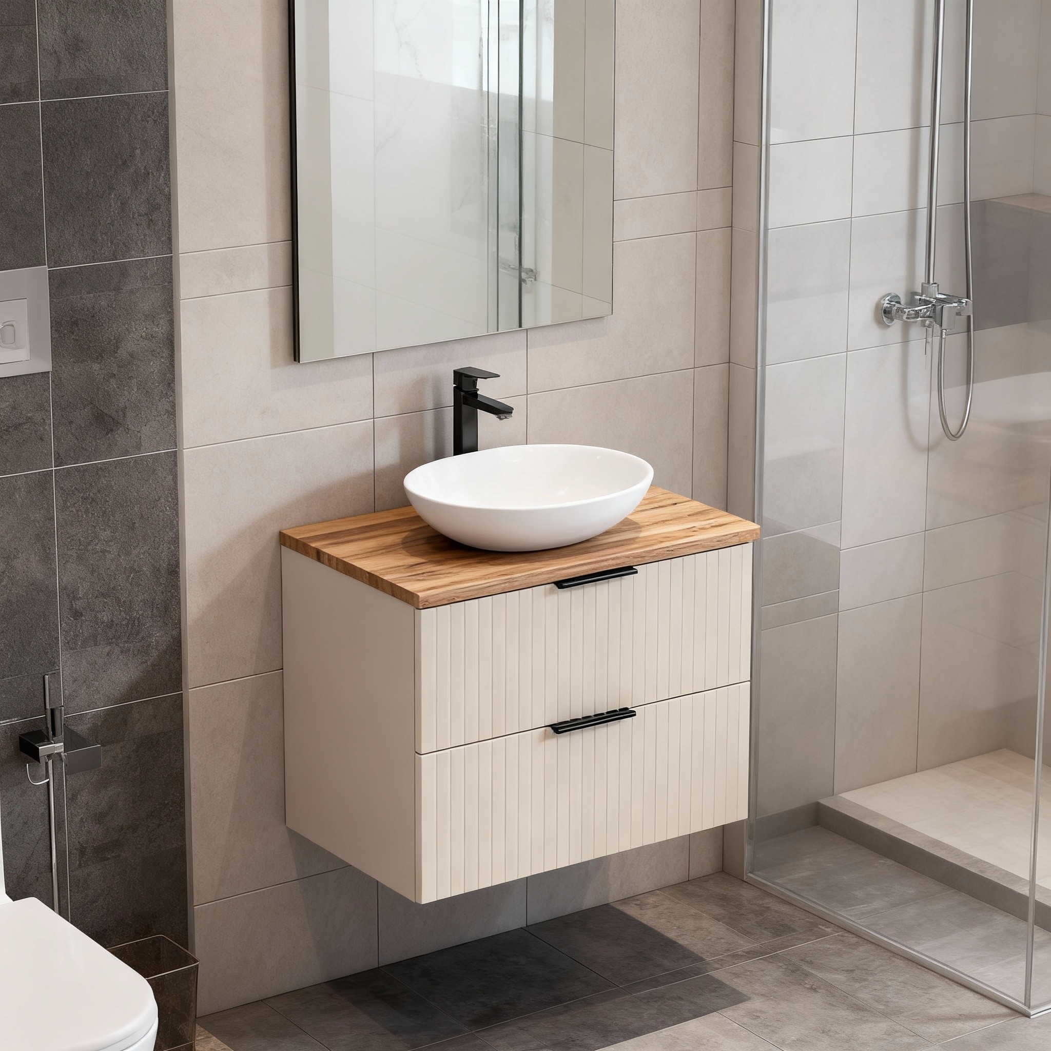 Ce meuble sous vasque suspendu de 60 cm est équipé de 2 tiroirs spacieux pour ranger vos essentiels de toilette. Le plan pour vasque inclus offre une surface d’utilisation pratique et design, parfait pour un usage quotidien.