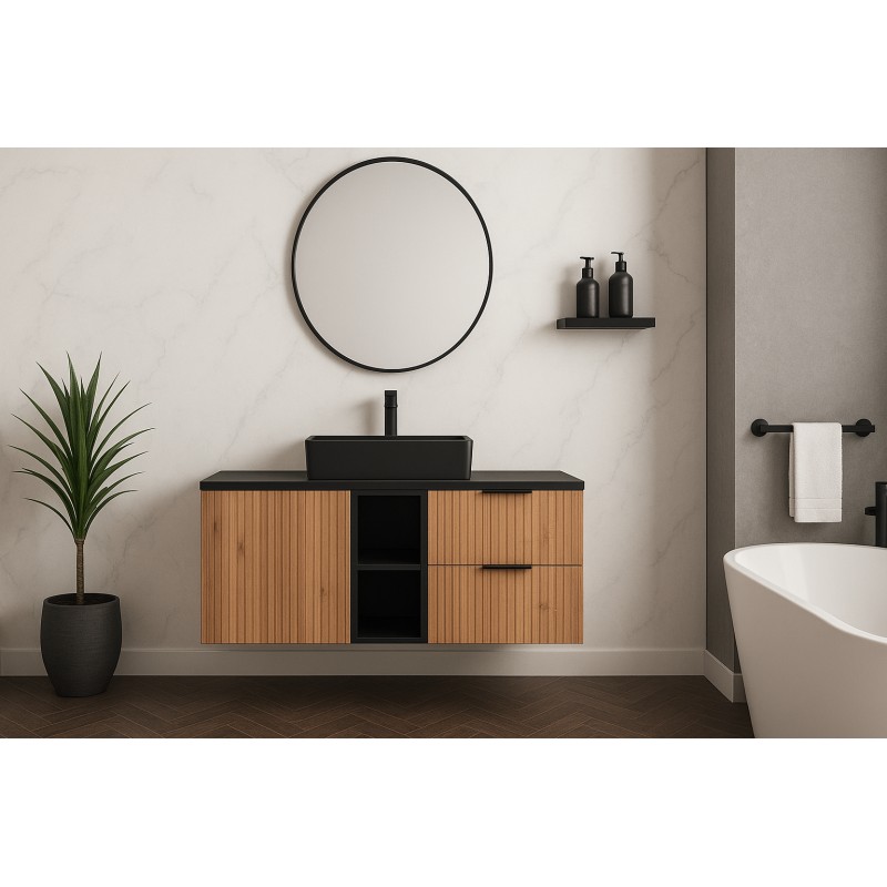 Le meuble sous vasque NOXERA 120 cm offre un vaste espace de rangement avec 2 tiroirs à fermeture douce et 1 porte avec panier à linge intégré. Les 2 niches ouvertes apportent une touche décorative tout en permettant un accès facile à vos essentiels du quotidien.