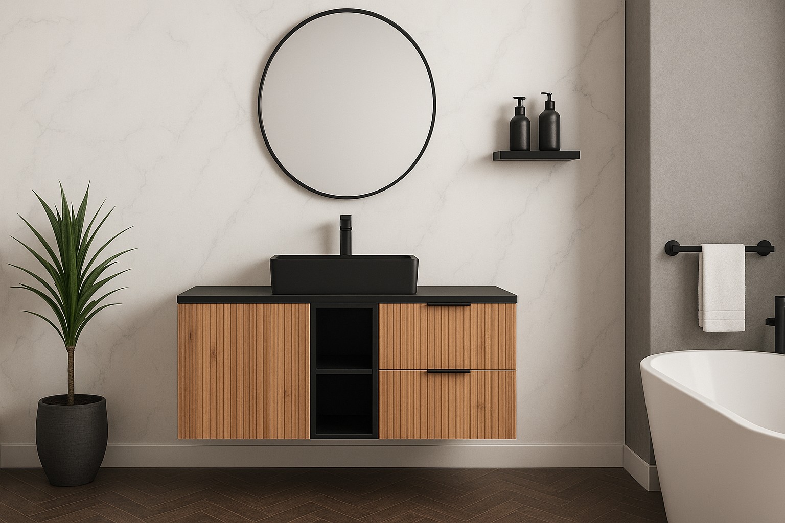 Fabriqué en panneaux de particules et MDF de première qualité, cet ensemble garantit solidité et durabilité. Son association du chêne wotan et du noir mat crée un contraste élégant et intemporel, idéal pour les salles de bain contemporaines.