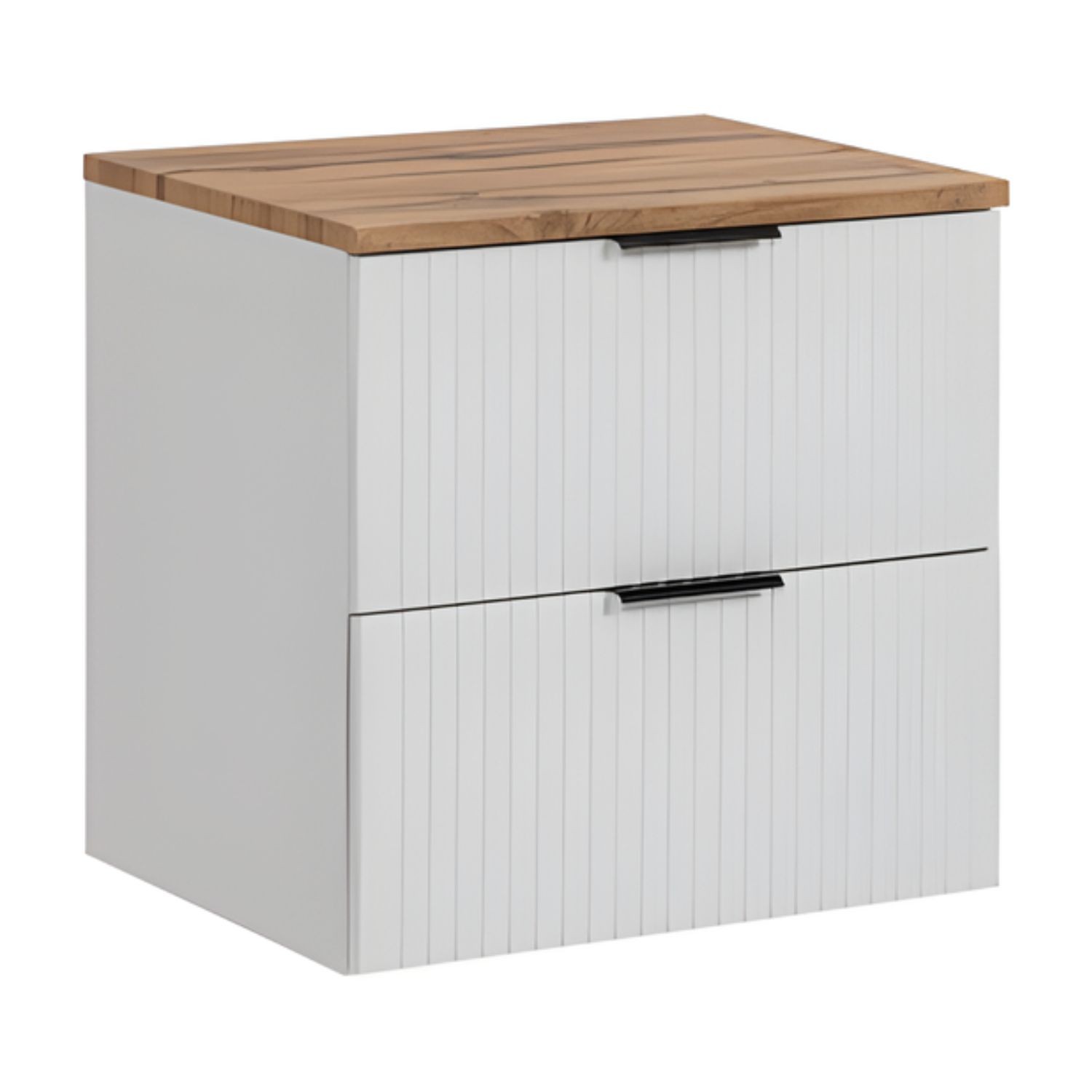 Alliez design et praticité avec le meuble de salle de bain NOXERA 60 cm, un modèle suspendu au charme naturel grâce à l’association du blanc mat et du chêne wotan. Compact et élégant, il s’adapte parfaitement aux petites et moyennes salles de bain.