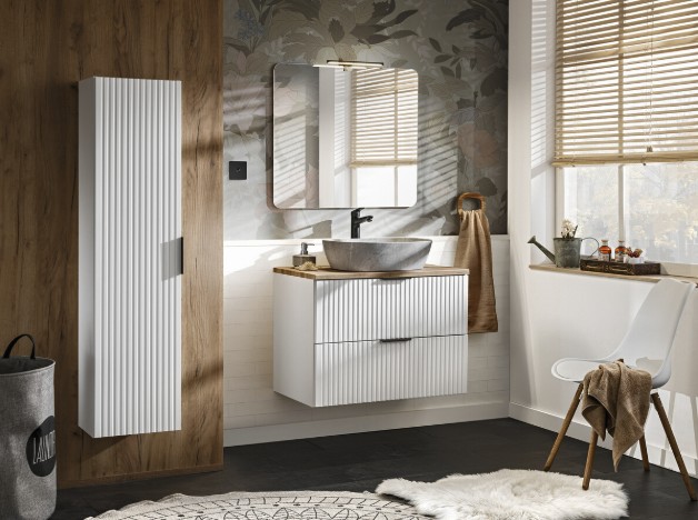 Offrez à votre salle de bain une atmosphère moderne et lumineuse avec l’ensemble NOXERA 80 cm. Sa finition blanc mat et chêne wotan associée à une vasque imitation marbre apporte élégance et raffinement à votre espace.