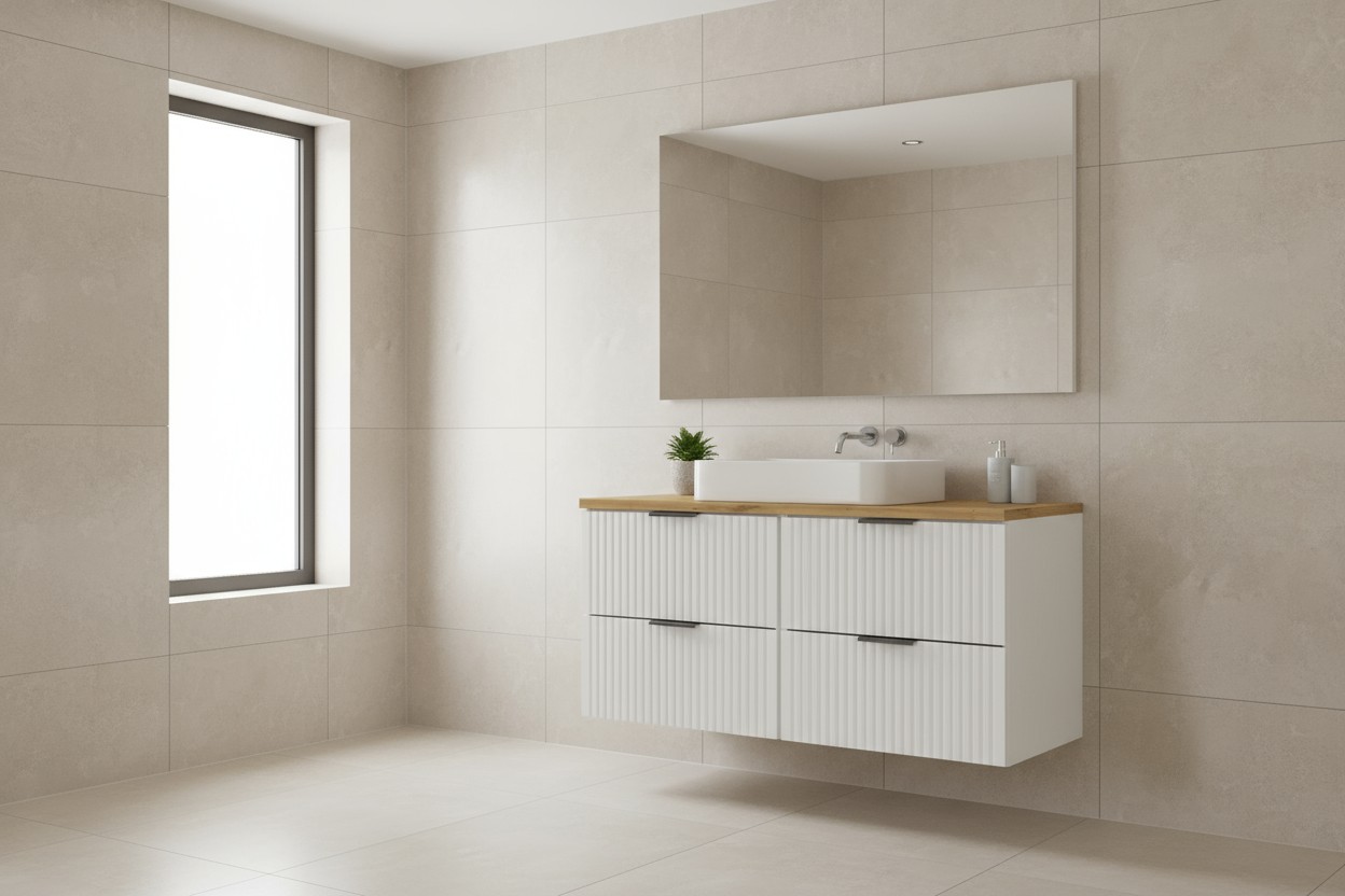Fabriqué en panneaux de particules et MDF de première qualité, le NOXERA 120 cm garantit une excellente durabilité et une finition soignée. Sa surface mate assure un entretien facile et résiste parfaitement à l’humidité du quotidien.