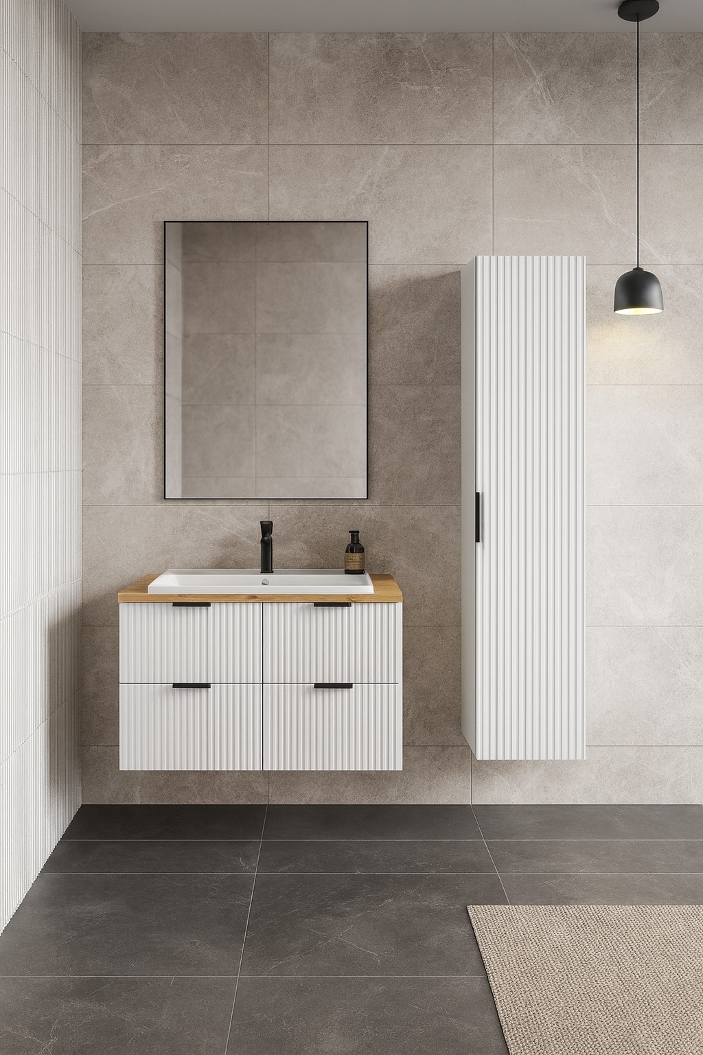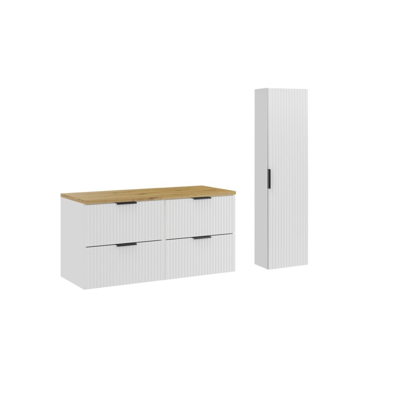 Le NOXERA 120 cm avec colonne murale est la solution idéale pour une salle de bain organisée et design. Ses lignes droites et ses tons naturels créent une atmosphère apaisante, parfaite pour les intérieurs modernes.