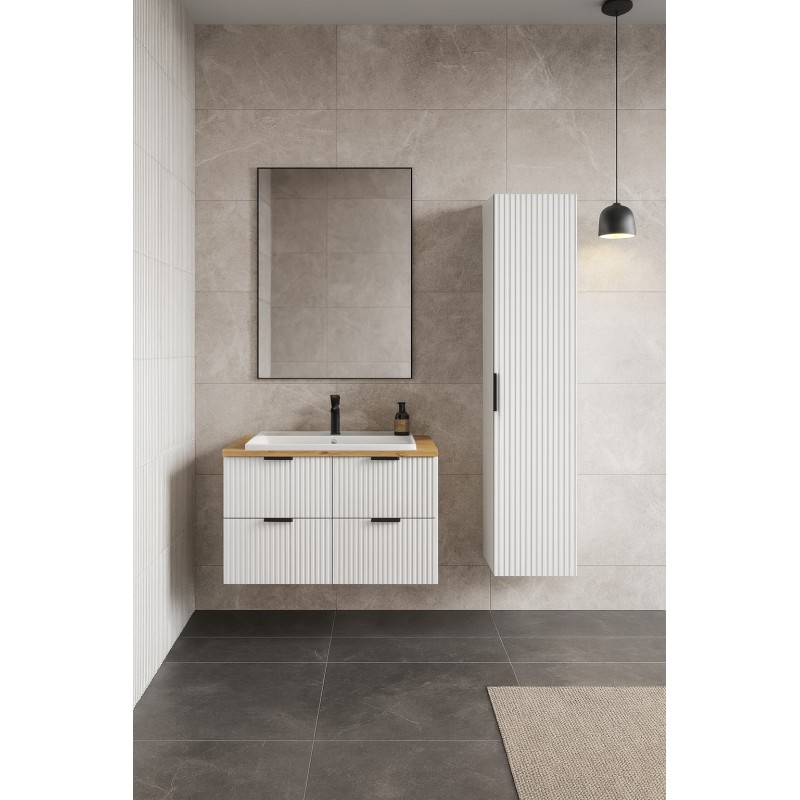 Avec ses 4 tiroirs à fermeture douce, l’ensemble NOXERA offre un volume de rangement généreux. La colonne murale haute permet d’organiser facilement serviettes, produits de beauté et accessoires. Sa structure suspendue facilite l’entretien et accentue le style aérien de votre salle de bain.