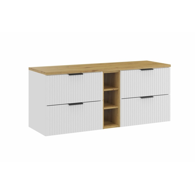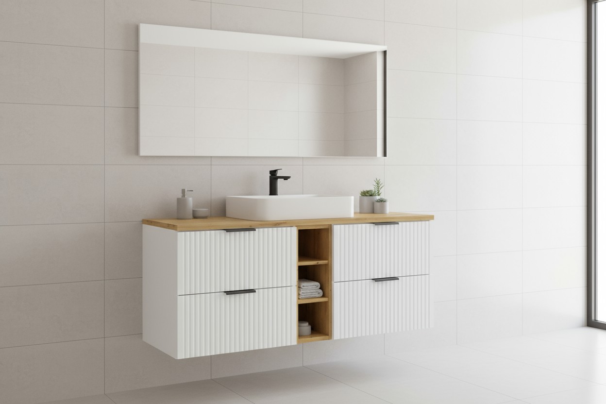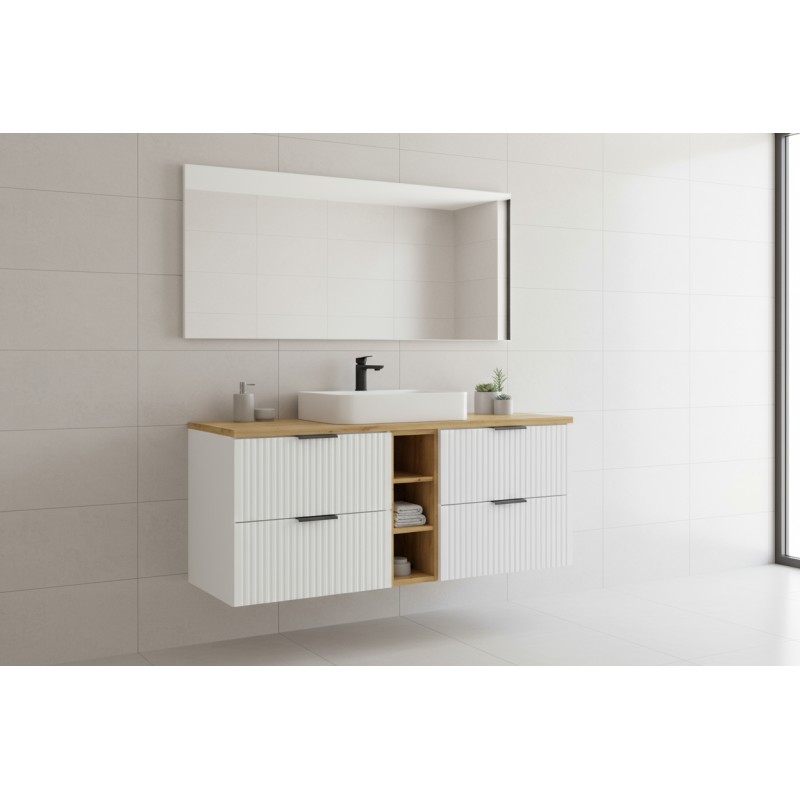 Grâce à ses lignes modernes et à ses finitions naturelles, le NOXERA 140 cm s’intègre aussi bien dans une salle de bain contemporaine que dans un intérieur au style nordique. Son plan pour vasque spacieux et ses niches ouvertes offrent une grande liberté d’aménagement.