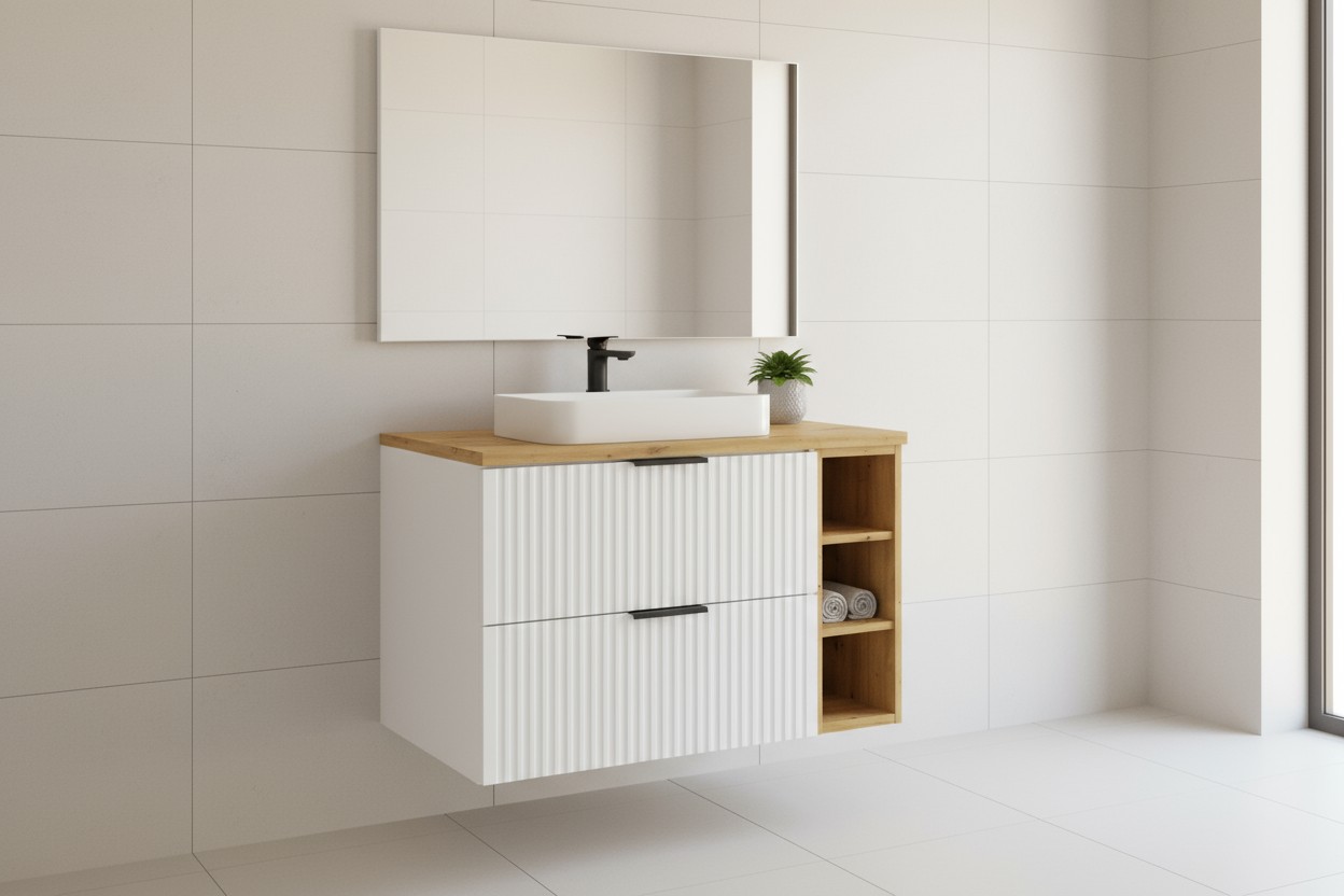Fabriqué en panneaux de particules et MDF de première qualité, le meuble NOXERA 80 cm allie robustesse et esthétique. Sa structure suspendue facilite le nettoyage du sol et accentue la sensation d’espace dans votre salle de bain.