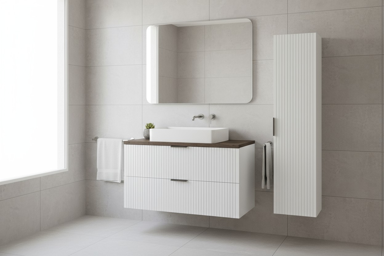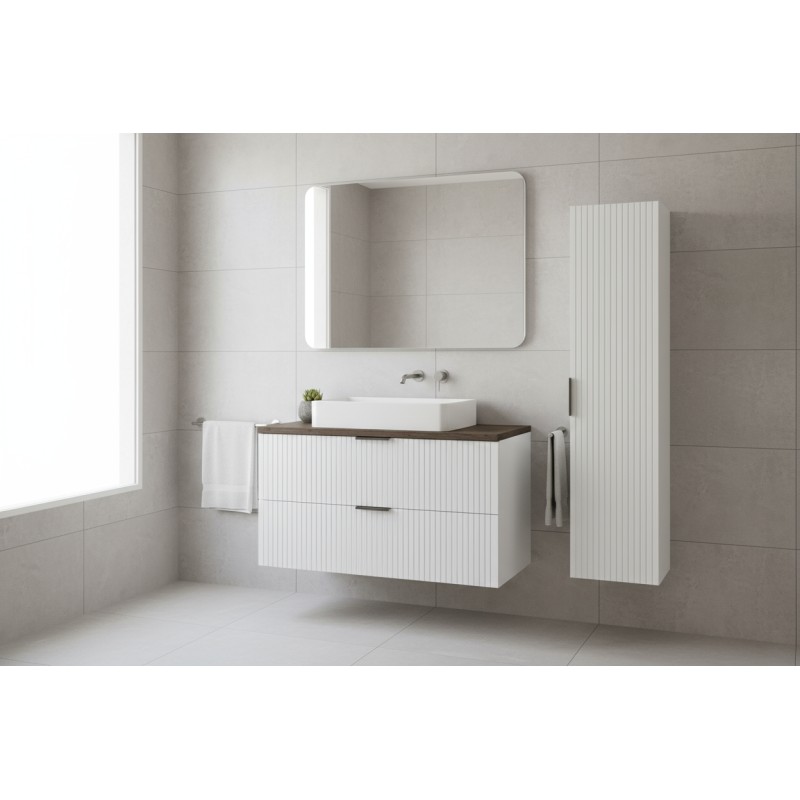 Le NOXERA 60 cm se compose d’un meuble sous vasque suspendu avec deux tiroirs spacieux, d’un plan pour vasque assorti et d’une colonne murale pour un rangement supplémentaire. Cet ensemble compact s’adapte parfaitement aux petites salles de bain sans faire de compromis sur le style.