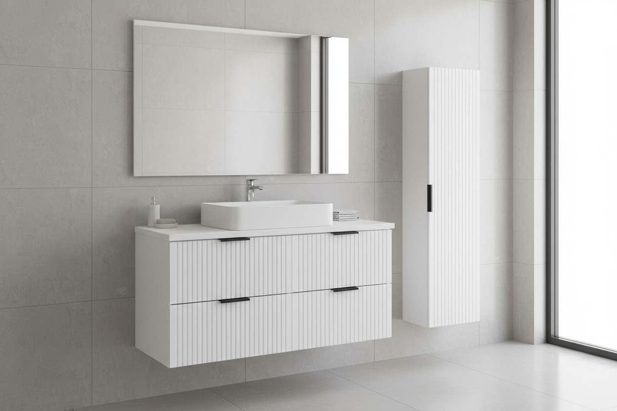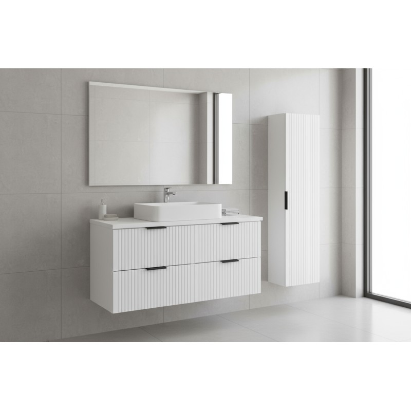 Le NOXERA 120 cm comprend deux meubles sous vasque suspendus de 60 cm chacun, un plan pour vasque de 120 cm et une colonne murale assortie pour un rangement optimal.