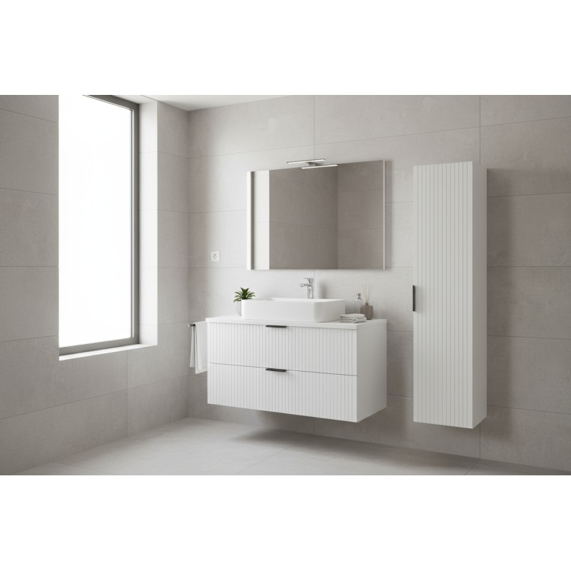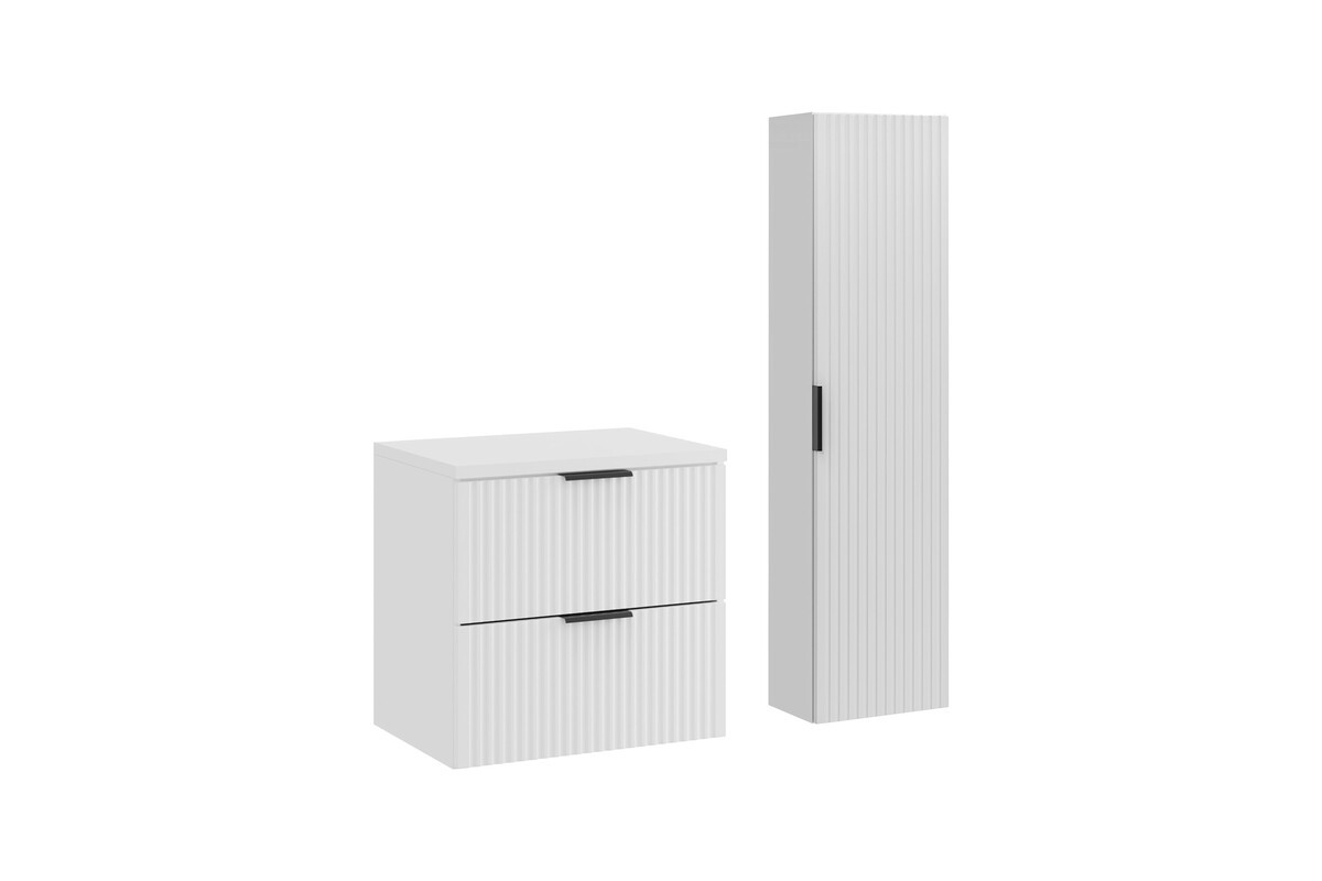 Grâce à sa finition blanche mate et à sa structure suspendue, l’ensemble NOXERA 60 cm s’intègre parfaitement dans les intérieurs modernes. La colonne suspendue permet d’ajouter un espace de rangement vertical sans encombrer le sol, pour une salle de bain toujours bien organisée.