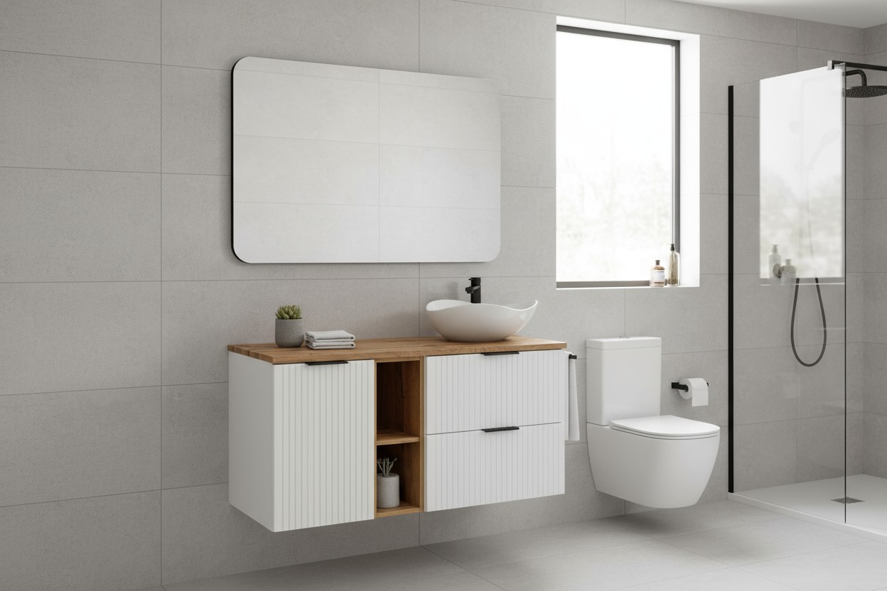 Fabriqué à partir de panneaux de particules et MDF de première qualité, cet ensemble garantit robustesse et résistance à l’humidité. Sa structure suspendue facilite l’entretien du sol tout en apportant un effet visuel léger et contemporain.