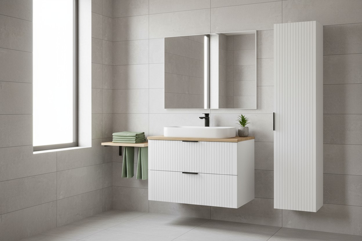 Idéal pour les espaces de taille moyenne, cet ensemble de salle de bain suspendu se compose d’un meuble sous vasque de 80 cm avec 2 tiroirs spacieux, d’un plan pour vasque en chêne wotan et d’une colonne murale suspendue blanche offrant un rangement vertical supplémentaire. Une solution design et pratique pour une salle de bain organisée et stylée.