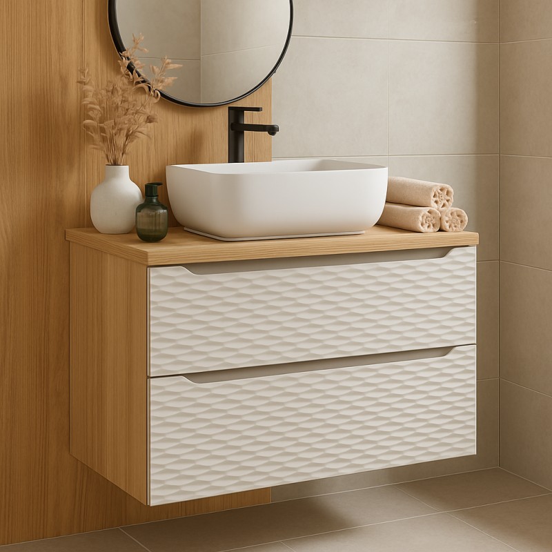 Alliant design contemporain et fonctionnalité, l’ensemble de salle de bain YOKA 80 cm est idéal pour les intérieurs à la recherche d’un mobilier suspendu à la fois élégant et compact. Son coloris chêne clair et beige mat crée une atmosphère apaisante et lumineuse, parfaite pour une salle de bain moderne.