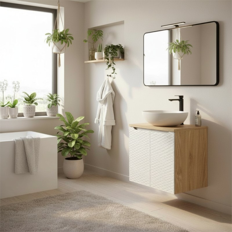 Conçu en MDF et panneaux de particules de première qualité, ce meuble suspendu est aussi robuste qu’élégant. Le plan vasque assorti complète l’ensemble avec finesse et sobriété. Idéal pour les petits espaces, cet ensemble offre un rangement pratique sans encombrer la pièce.