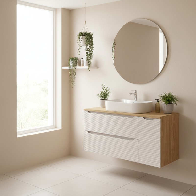 Composé de deux meubles sous vasque suspendus (un avec 2 tiroirs et un avec 1 porte battante) ainsi que d’un plan vasque assorti, cet ensemble offre une configuration complète et durable. Sa fabrication en MDF et panneaux de particules de première qualité garantit solidité, résistance à l’humidité et facilité d’entretien au quotidien.