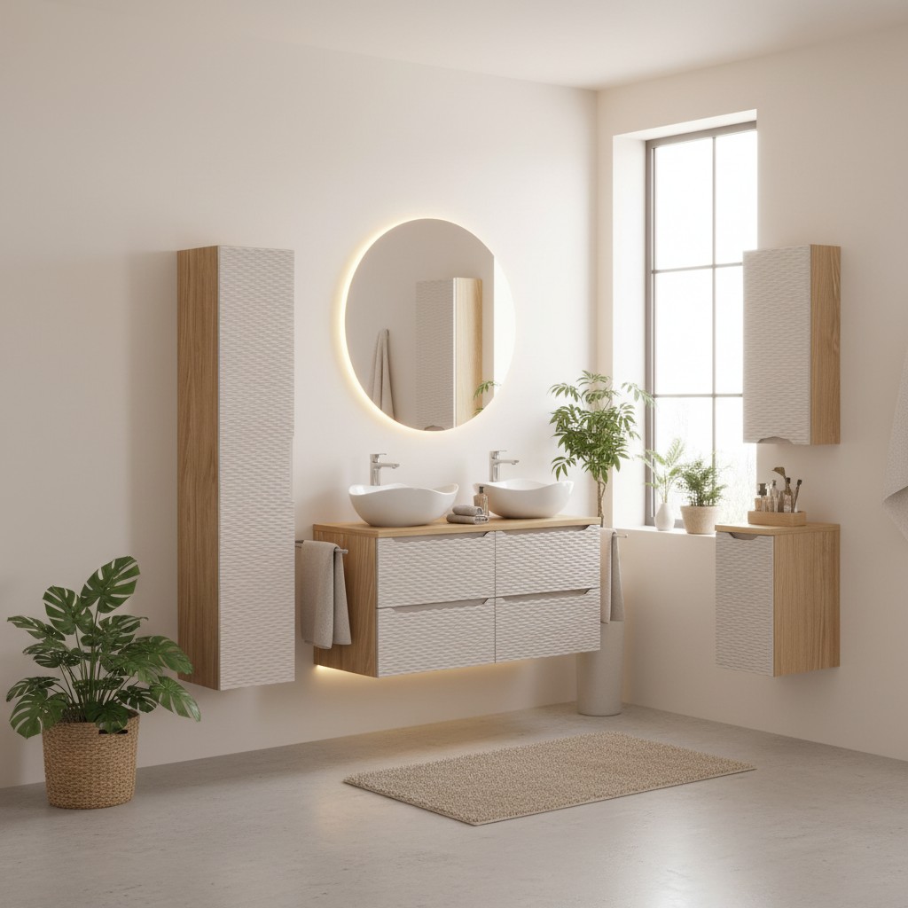 L’ensemble de salle de bain YOKA 120 cm est une véritable composition haut de gamme alliant design moderne et rangements généreux. Avec ses finitions chêne clair et beige mat, il apporte une atmosphère douce, naturelle et contemporaine à votre espace.