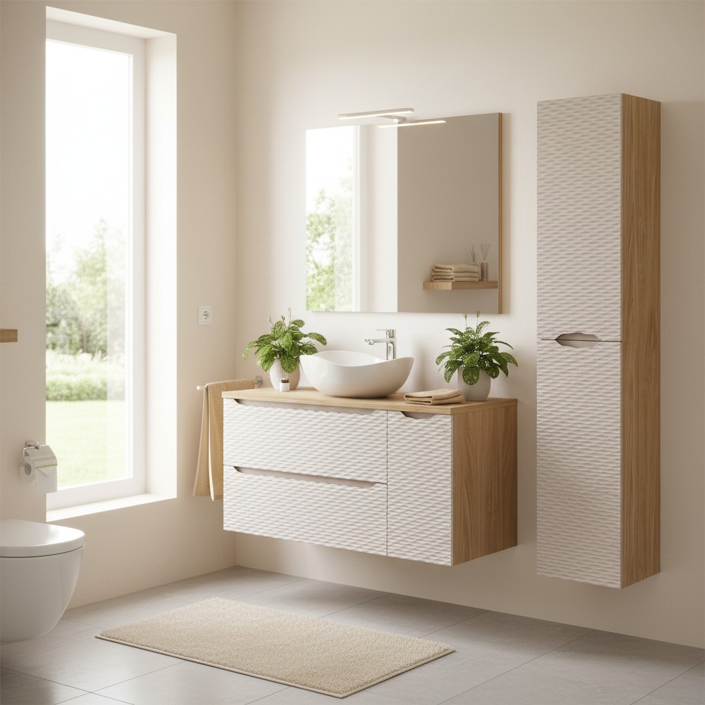 Composé de deux modules sous vasque suspendus, d’un plan vasque assorti, d’une vasque à poser en céramique blanche et d’une colonne haute de rangement, cet ensemble allie esthétisme et praticité. Sa structure en MDF et panneaux de particules garantit une excellente robustesse et une durabilité à toute épreuve.