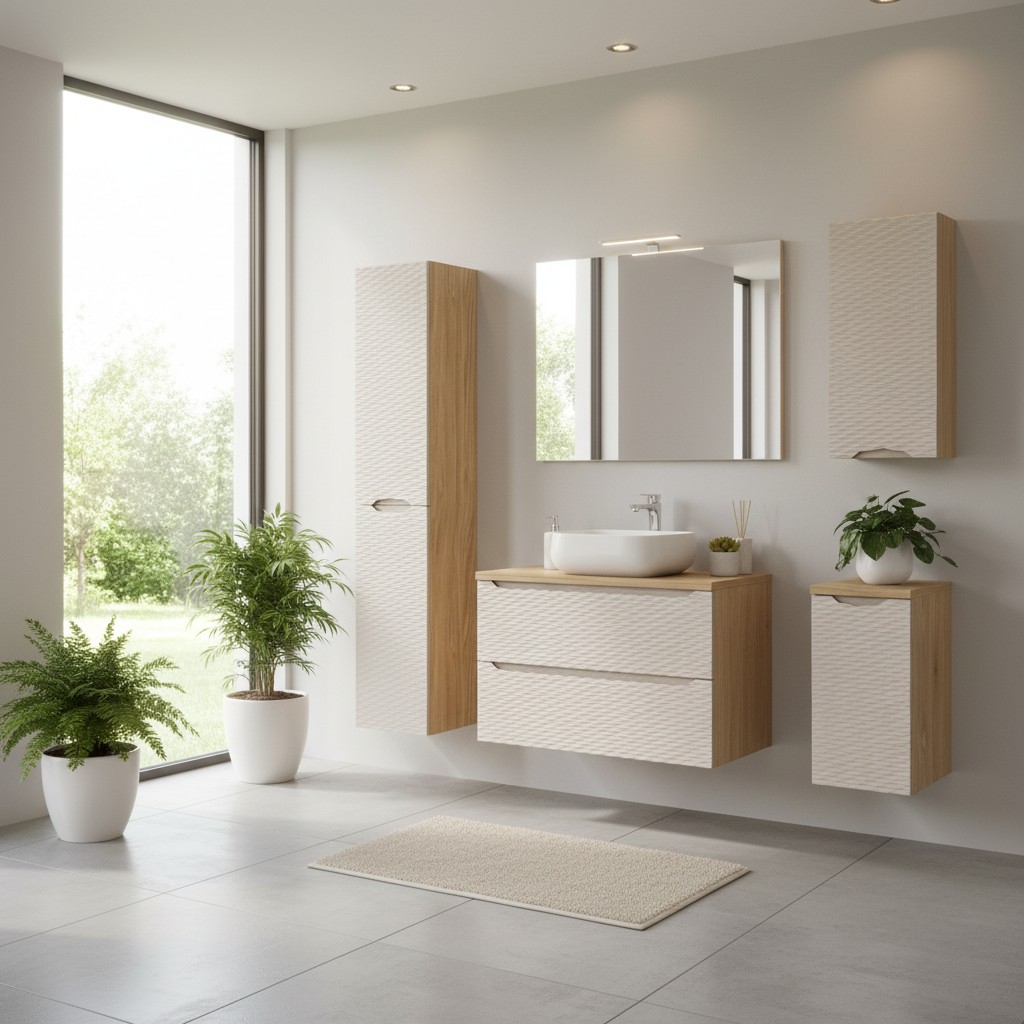 Complet et fonctionnel, il comprend un meuble sous vasque avec plan assorti, une vasque à poser en céramique blanche, une colonne haute de rangement ainsi que deux meubles complémentaires pour maximiser le stockage. Fabriqué en MDF et panneaux de particules de qualité, cet ensemble garantit robustesse et longévité.