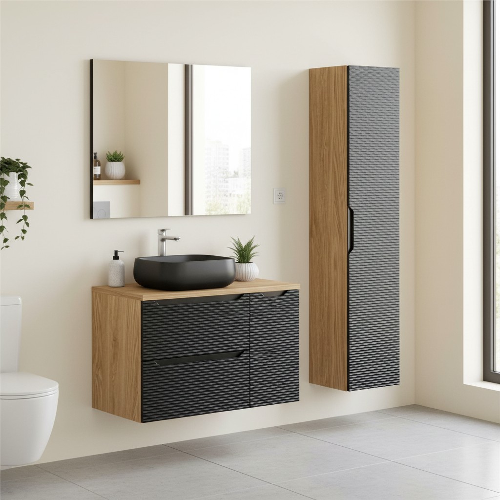 Optimisez l’espace de votre salle de bain avec cet ensemble YOKA 30 cm noir, idéal pour les petites pièces, toilettes ou salles d’eau. Il se compose d’un meuble sous vasque 30 cm équipé d’un placard de rangement pratique, ainsi que d’un plan pour vasque 30 cm. L’alliance du noir mat et du chêne clair apporte une touche moderne et chaleureuse.