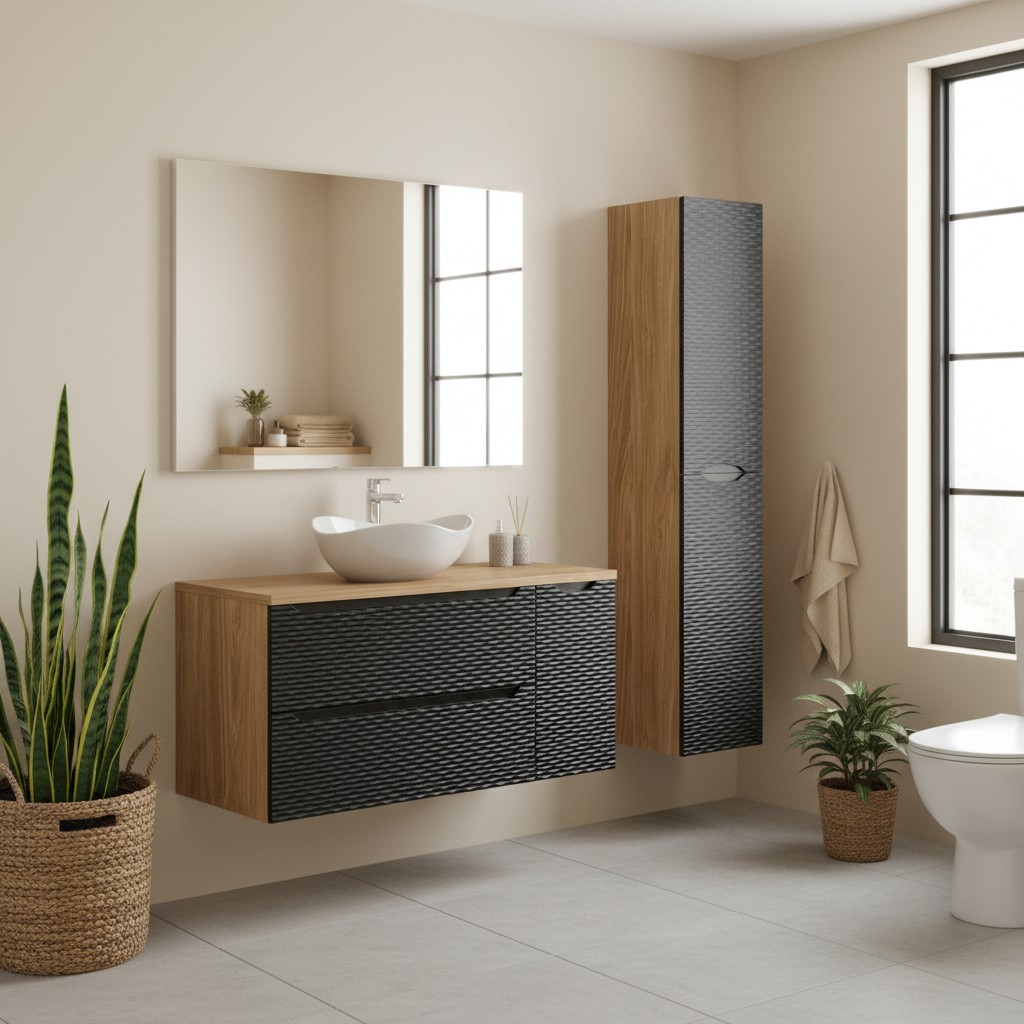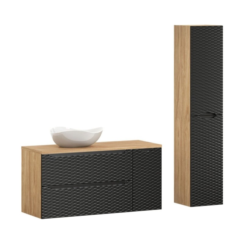 Aménagez votre salle de bain avec élégance grâce à cet ensemble YOKA 155 cm noir, combinant deux meubles sous vasque, un plan pour vasque 120 cm, une vasque à poser en céramique et une colonne de rangement assortie. Le contraste du noir mat et du chêne clair apporte un style moderne, chaleureux et tendance.