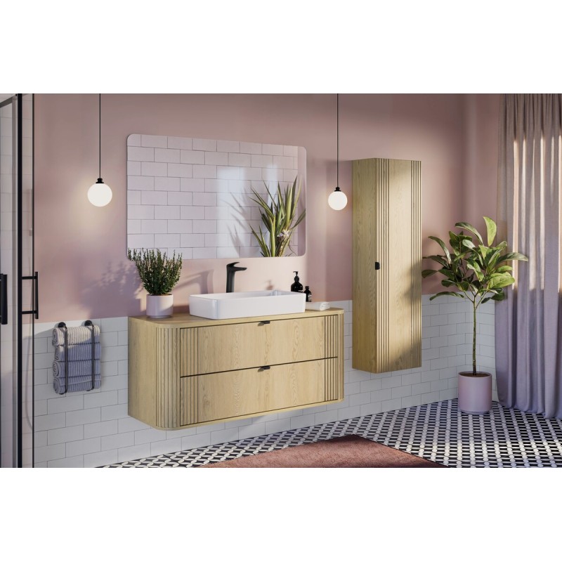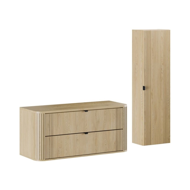 Équipez votre salle de bain avec cet ensemble KORI 120 cm, composé d’un meuble sous vasque suspendu, d’un plan pour vasque 120 cm et d’une colonne de rangement assortie. Sa finition chêne clair apporte une atmosphère naturelle et moderne, idéale pour une salle de bain actuelle.