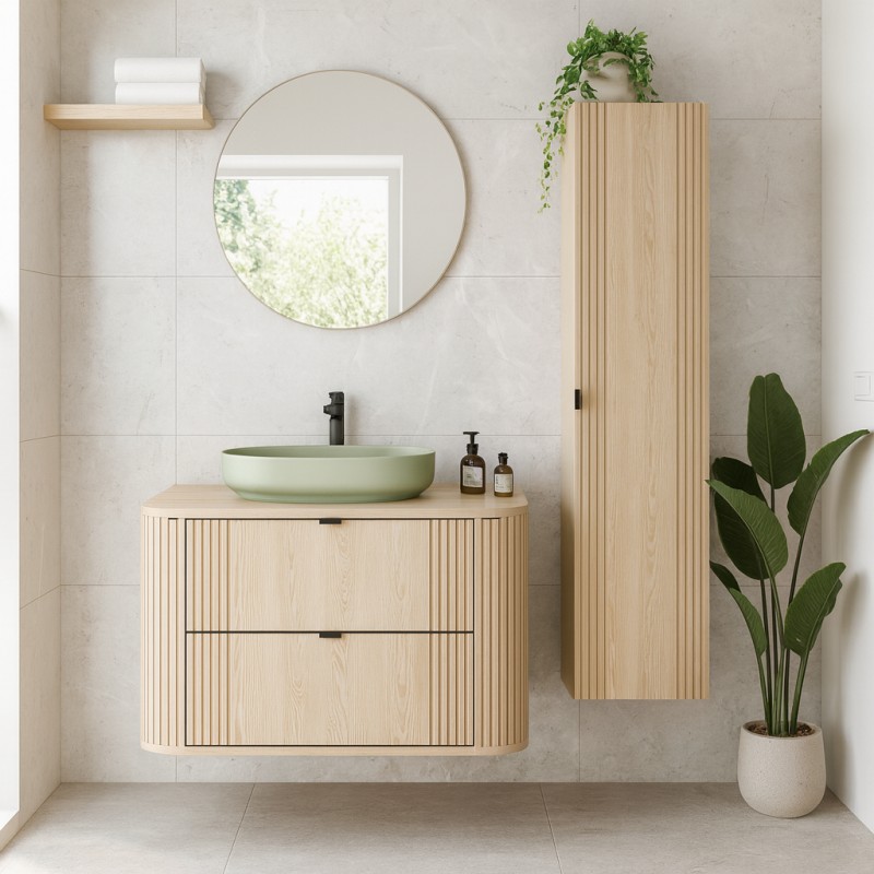 Apportez une touche moderne et chaleureuse à votre salle de bain avec cet ensemble KORI 80 cm chêne clair. Il se compose d’un meuble sous vasque suspendu, d’un plan pour vasque, d’une vasque à poser design et d’une colonne de rangement assortie.