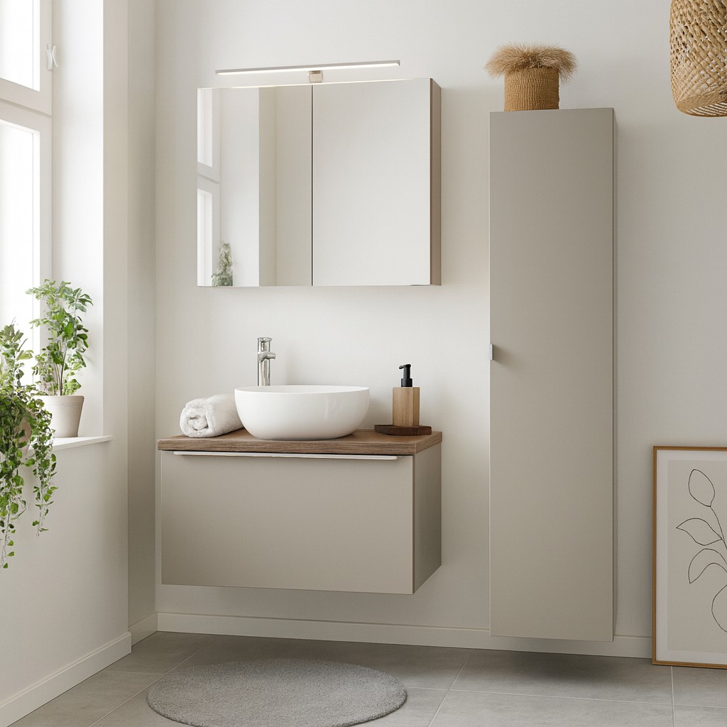 Le miroir équipé d’une LED apporte un éclairage élégant et pratique. La finition taupe mate et la structure en MDF et panneaux de particules de qualité garantissent robustesse, durabilité et facilité d’entretien au quotidien.