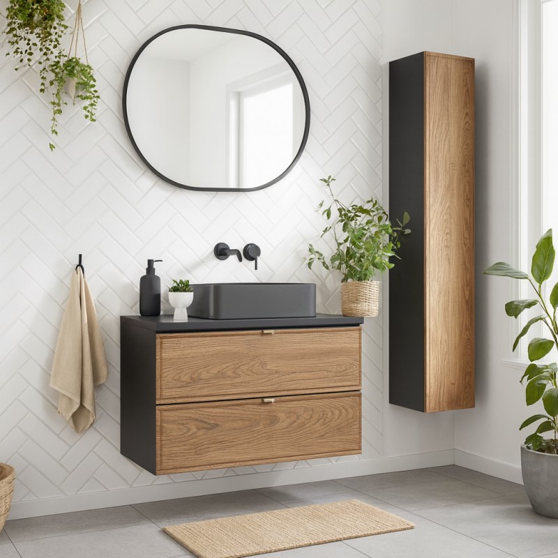 Apportez une touche moderne et chaleureuse à votre salle de bain avec cet ensemble SAVIA 80 cm. Il réunit un meuble sous vasque suspendu, une vasque à poser grise rectangulaire, un miroir LED et une colonne de rangement. Le mariage du bois foncé et du noir mat crée un style contemporain et élégant.