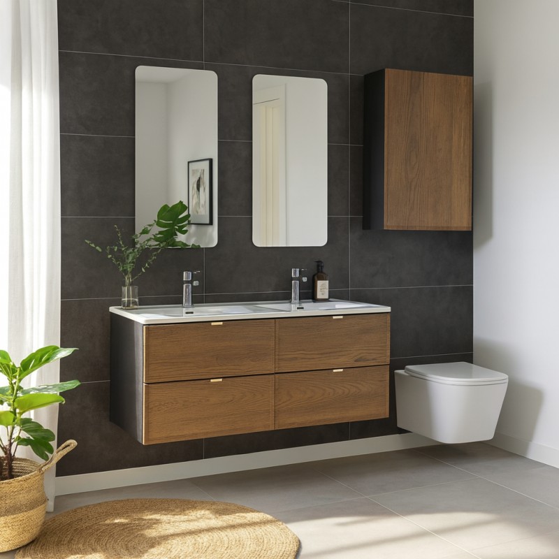Optimisez votre salle de bain avec cet ensemble complet SAVIA 120 cm, combinant double vasque encastrée, meubles suspendus, rangement latéral, miroirs LED et même un WC assorti. Le design bois foncé et noir mat apporte une ambiance moderne et élégante.