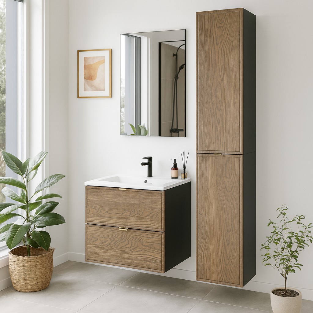 Optimisez votre salle d’eau avec cet ensemble SAVIA 60 cm comprenant un meuble sous vasque suspendu, une vasque blanche encastrée et deux meubles de rangement assortis. Un set idéal pour les petites et moyennes salles de bain.
