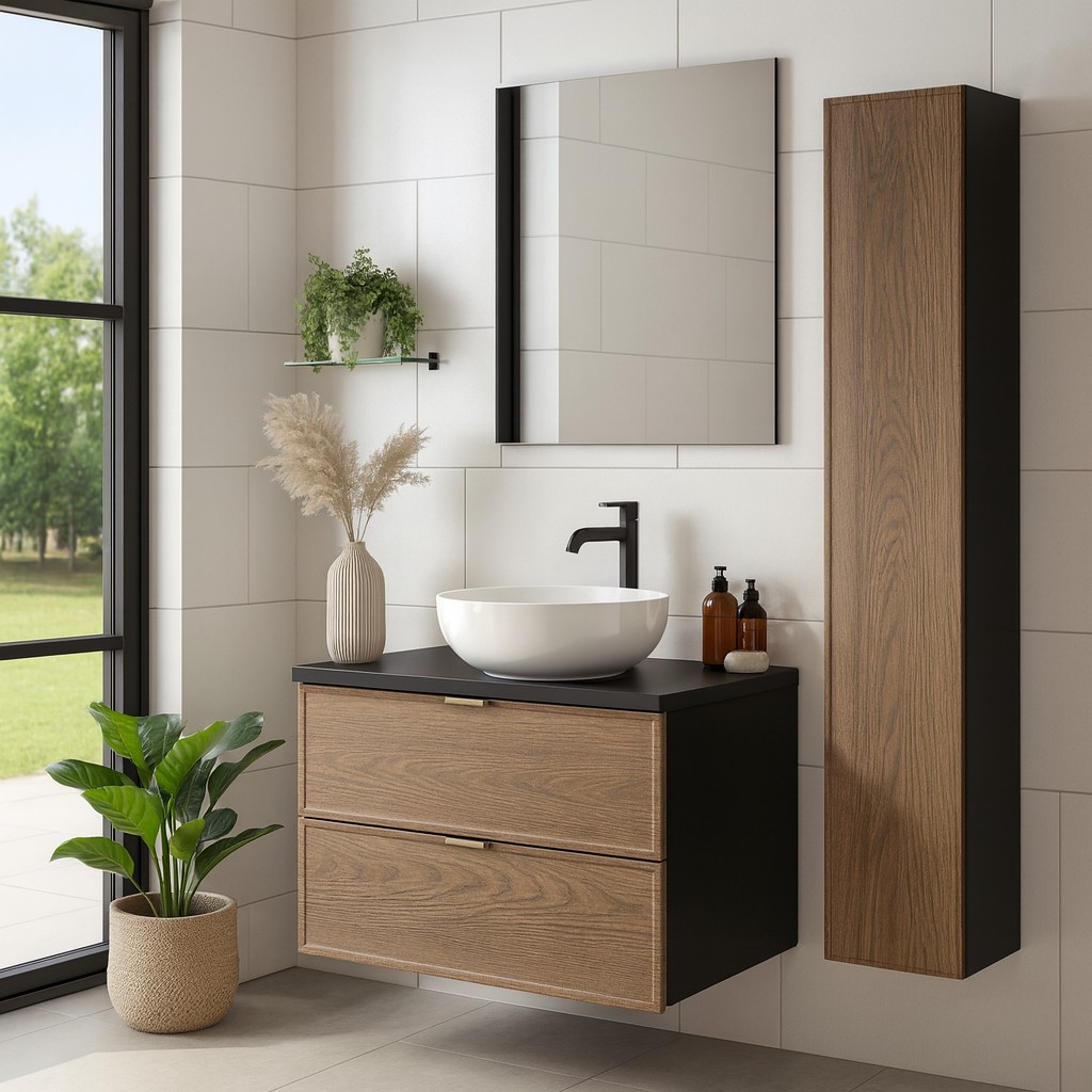 Ce set SAVIA 80 cm offre une solution élégante et pratique pour moderniser votre salle de bain. Il comprend un meuble sous vasque suspendu, un plan pour vasque assorti et une colonne de rangement dans une finition bois foncé au style contemporain.