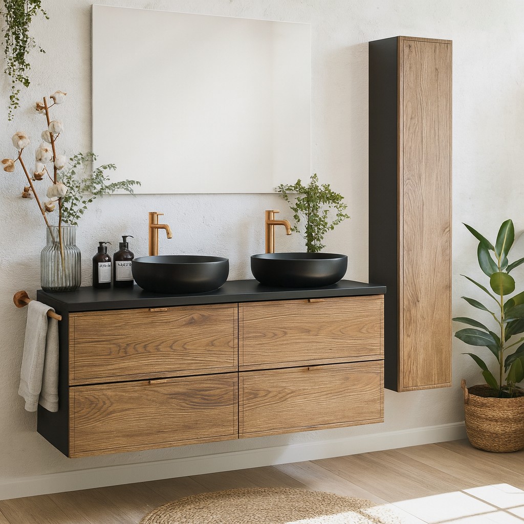 Les vasques en céramique noire effet mat apportent une touche premium, tandis que la colonne de rangement incluse offre des espaces supplémentaires pour un quotidien parfaitement organisé.