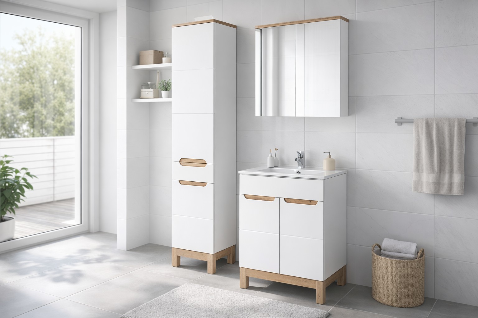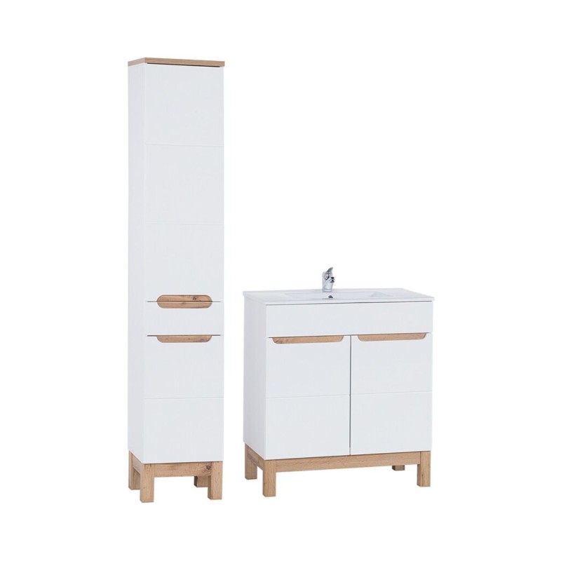 Grâce à son format équilibré, cet ensemble offre un excellent compromis entre surface de rangement et encombrement maîtrisé. Le meuble sous vasque permet d’organiser efficacement les produits du quotidien, tandis que la colonne haute optimise le rangement vertical sans surcharger l’espace. L’association du blanc brillant et du chêne clair apporte une touche lumineuse et intemporelle, idéale pour créer une salle de bain moderne, facile à vivre et agréable au quotidien.