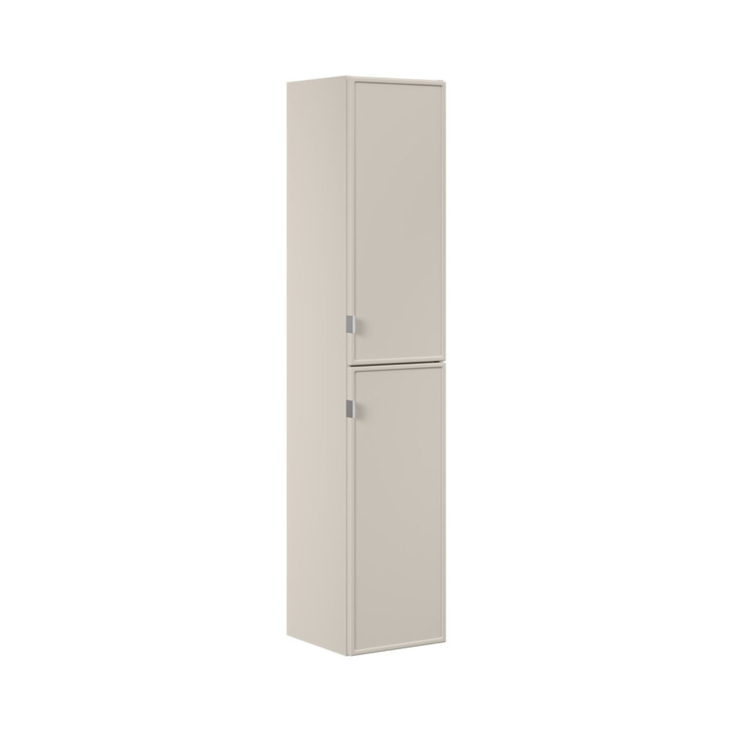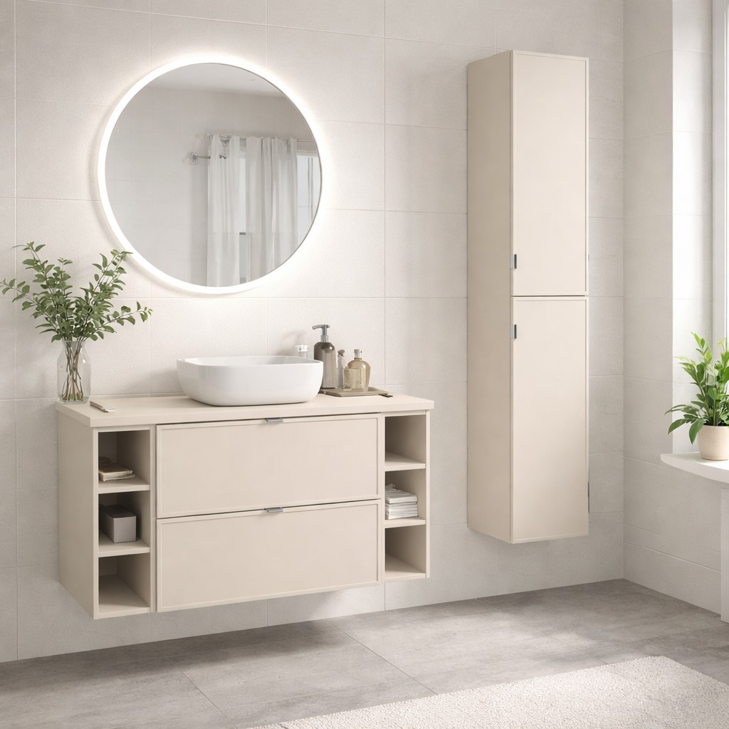Les niches visibles structurent visuellement l’ensemble tout en facilitant l’accès aux objets du quotidien, idéales pour exposer linge de toilette ou accessoires déco. La colonne optimise le rangement vertical sans encombrer l’espace au sol, tandis que la vasque à poser apporte une touche contemporaine et raffinée. La finition cachemire mat renforce l’identité chaleureuse et originale de cet ensemble, parfaitement adapté à une salle de bain moderne recherchant à la fois style, confort et praticité.