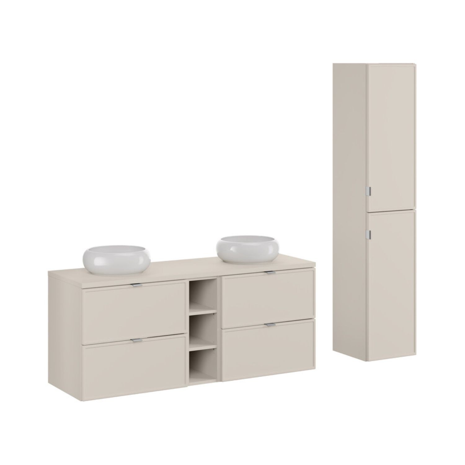 Apportez modernité et élégance à votre intérieur avec cet ensemble de salle de bain BRAZZA 140 cm en finition cachemire mat. Cette composition complète associe deux meubles sous vasque, un module avec 3 niches visibles, un plan pour vasque, deux vasques rondes à poser en céramique ainsi qu’une colonne de rangement assortie.