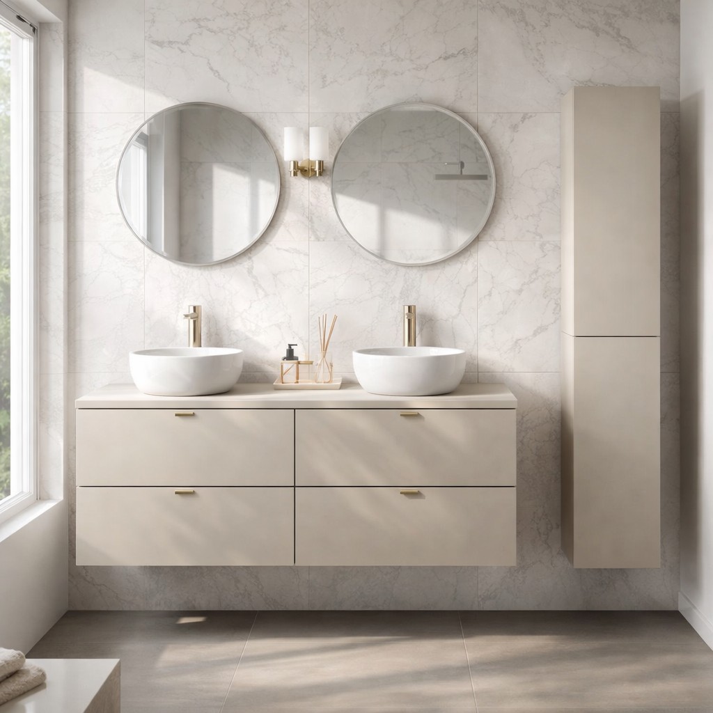 Apportez modernité et fonctionnalité à votre intérieur avec cet ensemble de salle de bain BELLA 120 cm en finition cachemire mat. Il se compose de deux meubles sous vasque, d’un plan pour vasque assorti et de deux rangement suspendues formant une colonne, offrant une solution complète et harmonieuse.