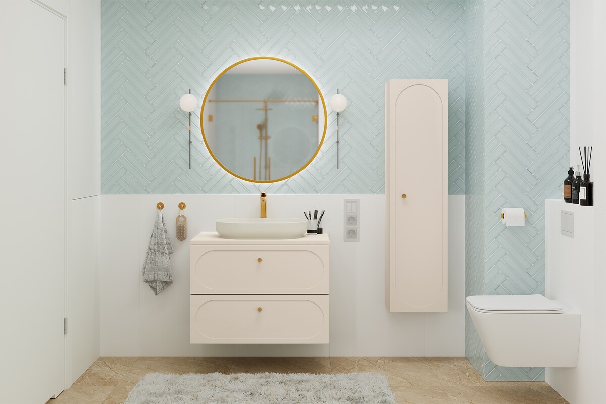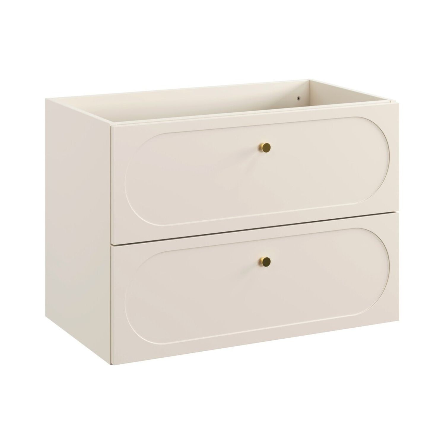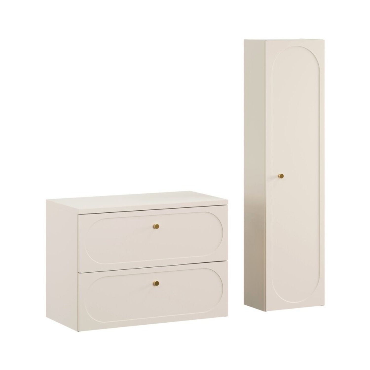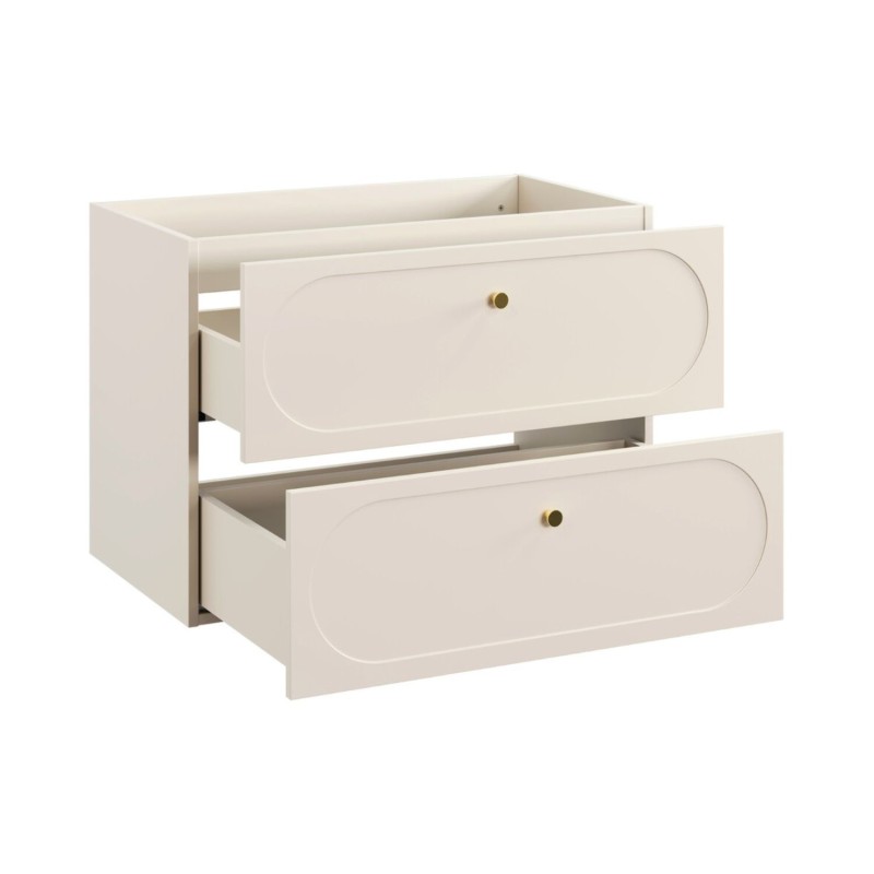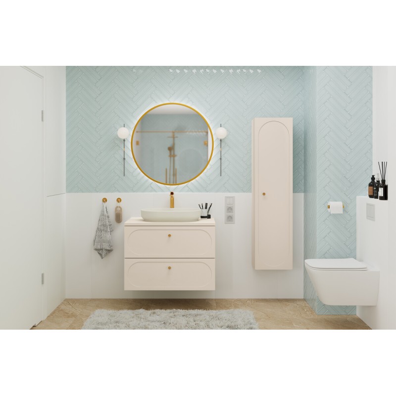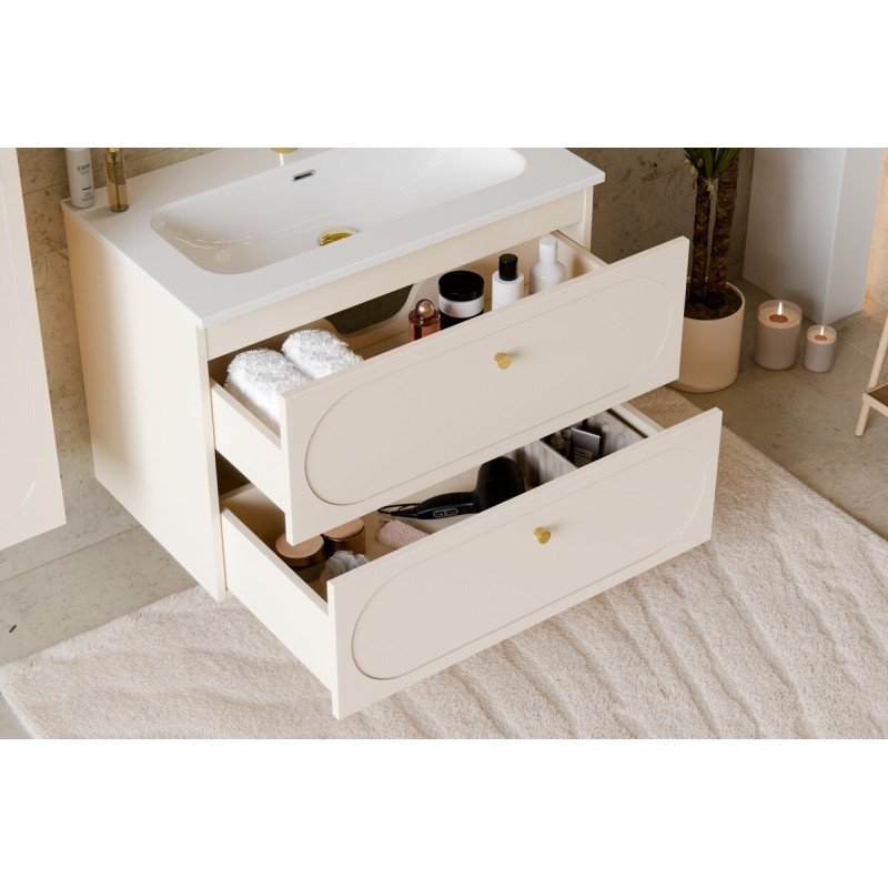 Le meuble sous vasque se distingue par ses poignées aux finitions dorées et ses façades décorées d’un encadrement ovale légèrement creusé, apportant du relief et une signature esthétique raffinée. Les tiroirs coulissants offrent un rangement pratique au quotidien. La colonne de rangement reprend les mêmes codes décoratifs avec une poignée dorée et une façade ornée d’un encadrement ovale, assurant une parfaite cohérence visuelle. Le plan pour vasque beige sable vient compléter l’ensemble avec élégance.