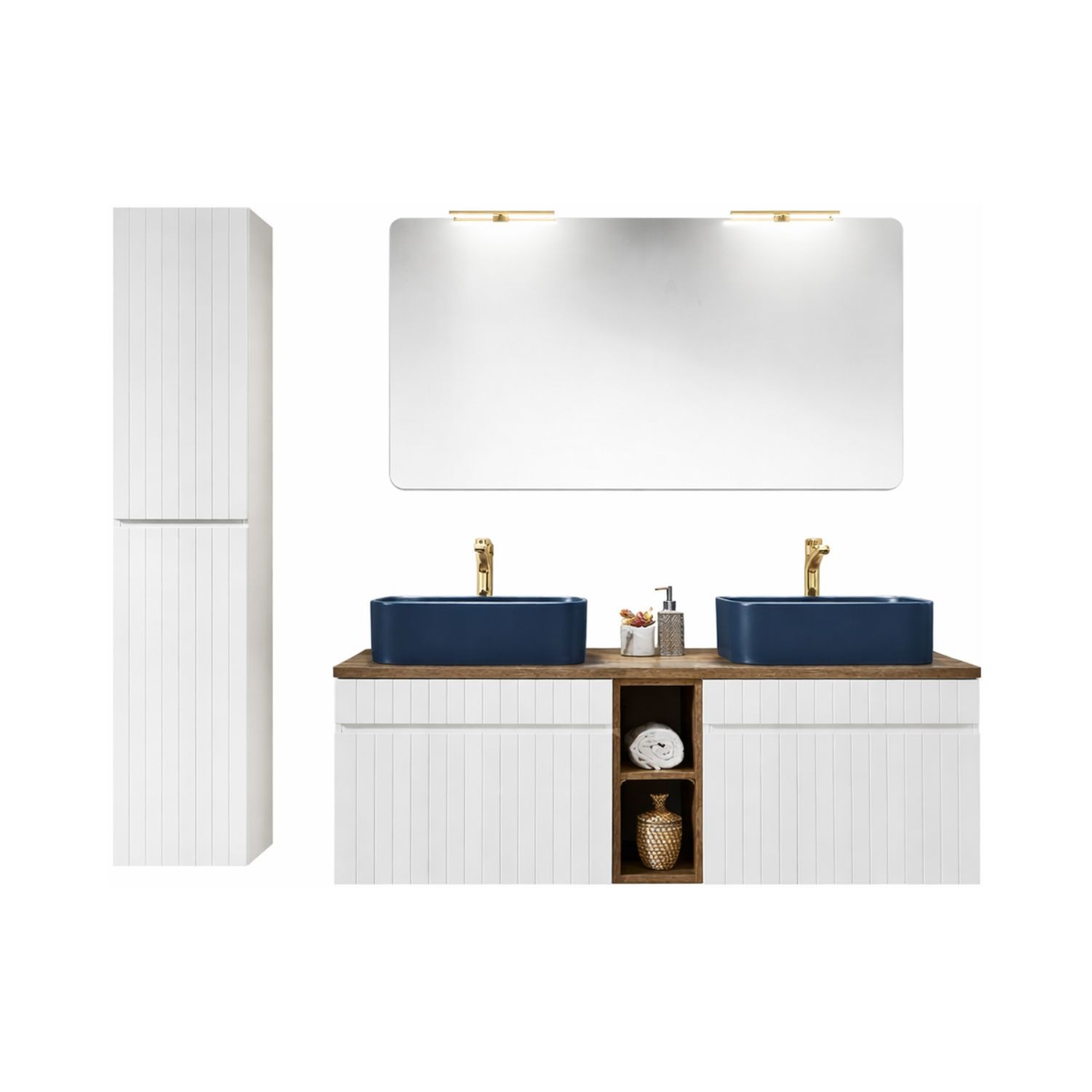Ensemble ICON blanc : meubles sous vasque 140cm avec niches visibles bois + deux vasques à poser bleues + miroir + LEDs + colonn
