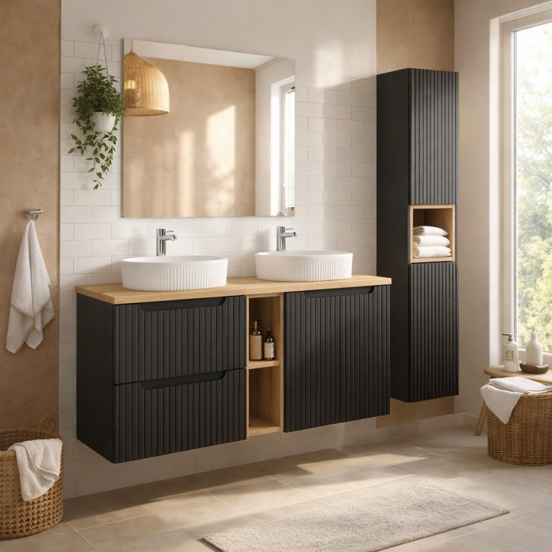 Les meubles présentent des façades rainurées verticalement qui apportent du relief et une touche décorative raffinée. Le contraste entre le noir mat et le bois clair crée un équilibre esthétique moderne, idéal pour une salle de bain design et chaleureuse.