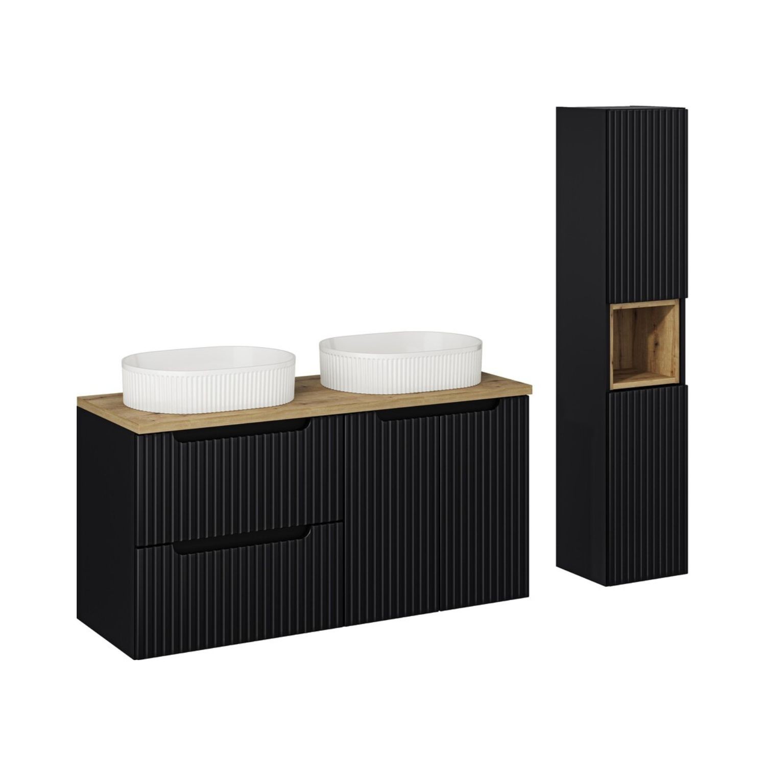 L’ensemble de salle de bain suspendu VANO 150 cm séduit par son design contemporain et ses nombreux rangements. Cette composition associe meubles sous vasque noir mat, plan pour vasque aspect chêne clair et deux vasques à poser ovales, pour créer un espace élégant et fonctionnel.