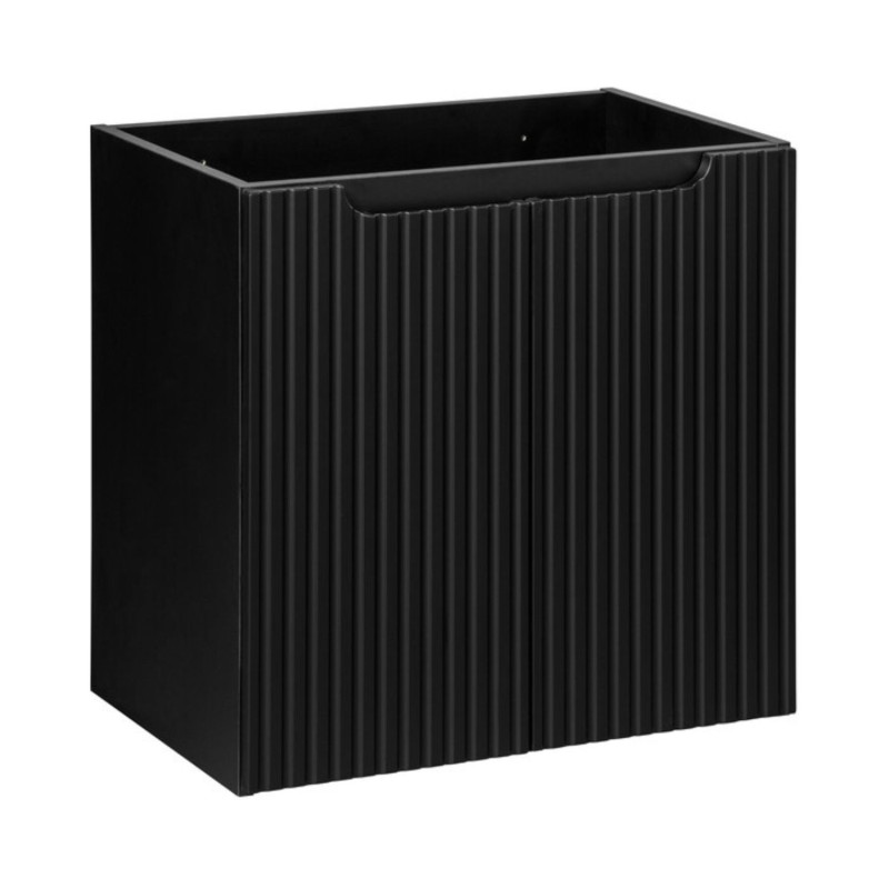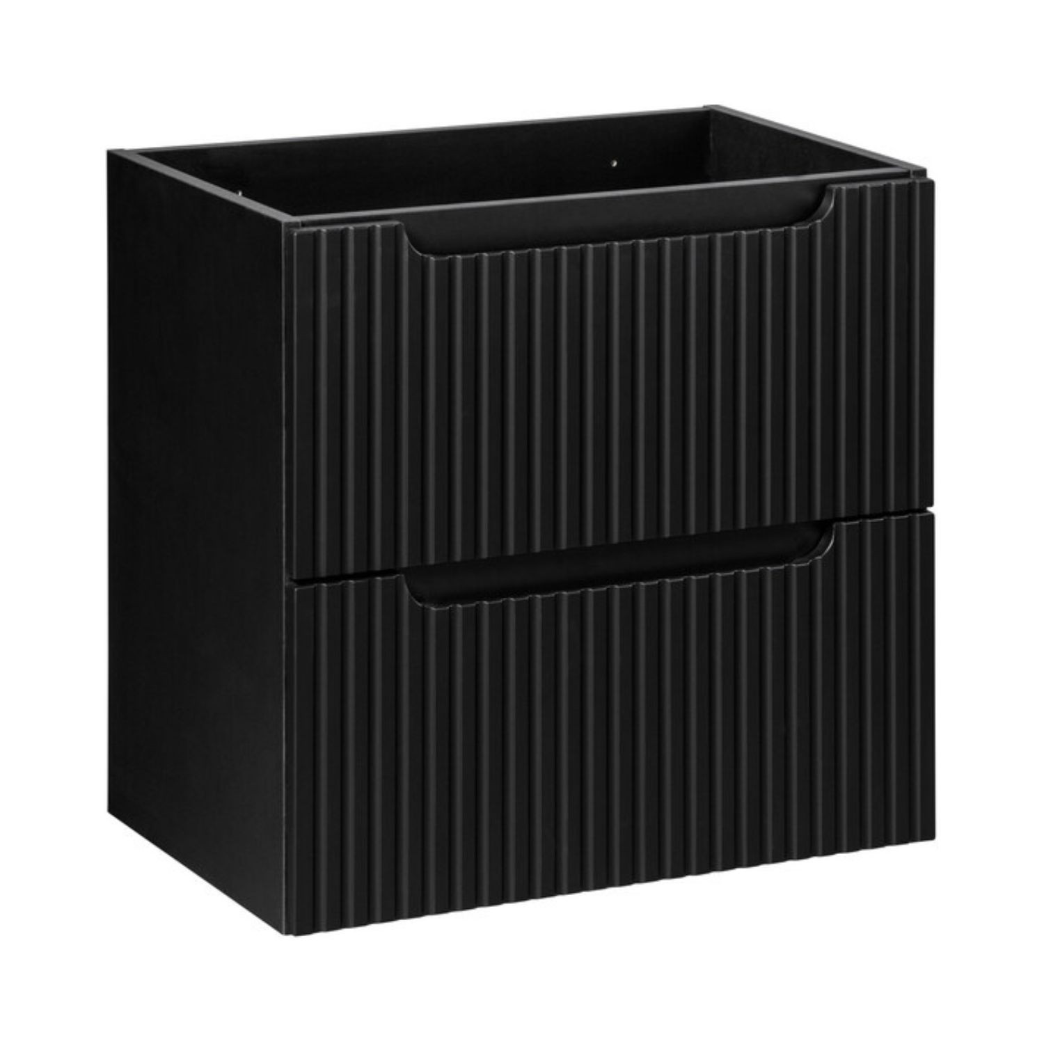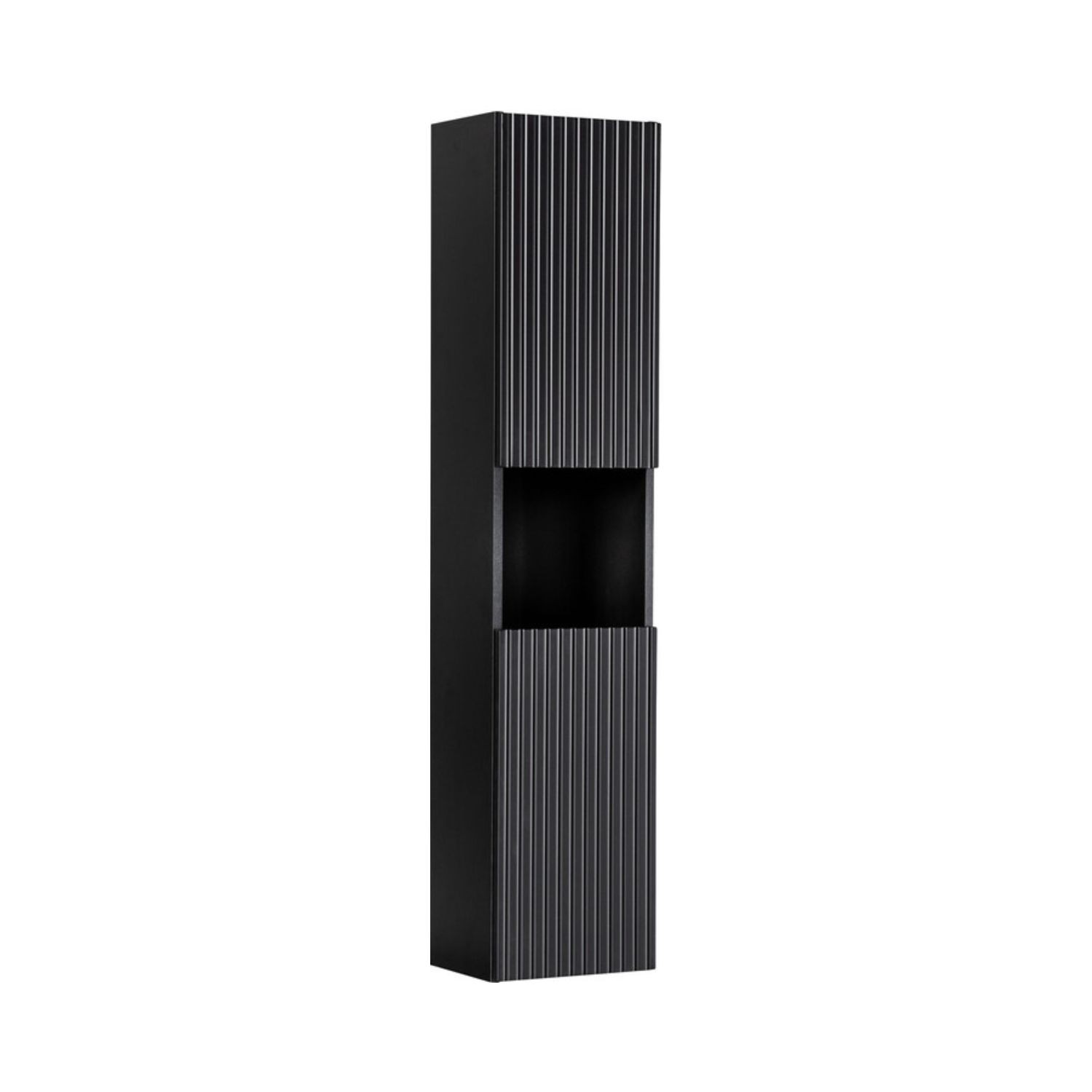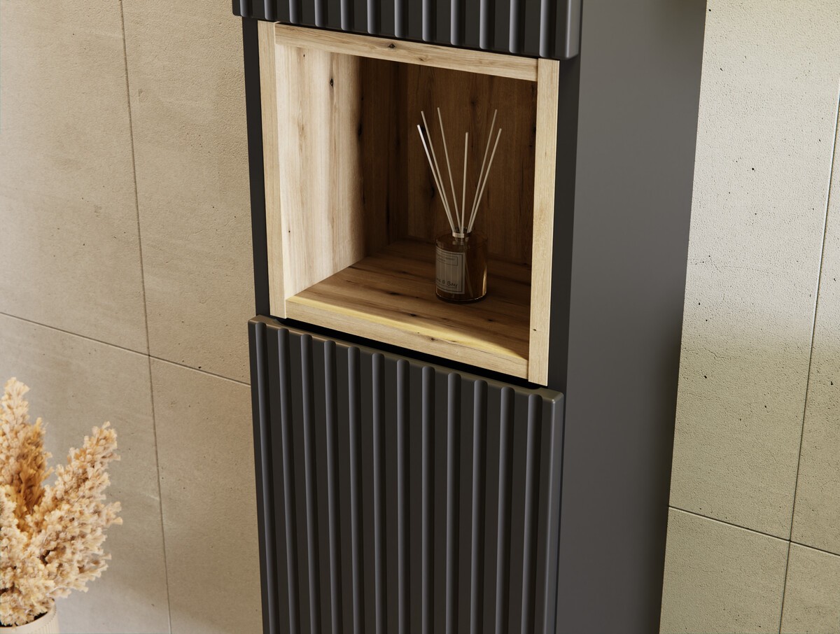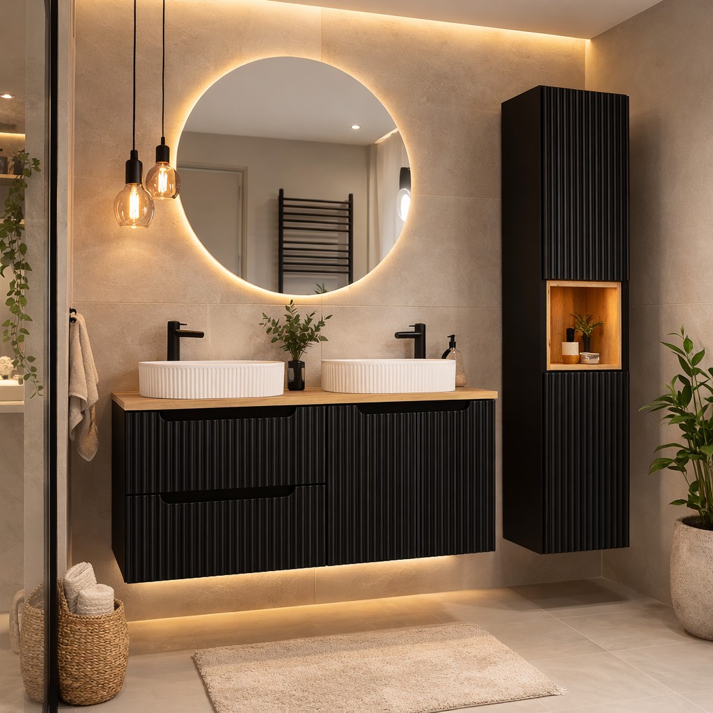 Les meubles présentent des façades rainurées verticalement qui apportent du relief et renforcent le style moderne de l’ensemble. L’association du noir mat et du bois clair crée un contraste harmonieux qui s’intègre parfaitement dans une salle de bain design et chaleureuse.