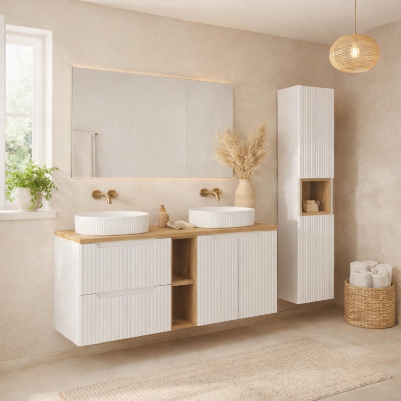 L’ensemble de salle de bain VANO 170 cm est une solution complète et élégante pour aménager une salle de bain moderne et fonctionnelle. Cette composition associe des meubles sous vasque suspendus blanc mat avec façades rainurées verticalement, un plan pour vasque aspect chêne clair, deux vasques à poser ovales ainsi qu’une colonne de rangement avec cube intégré.