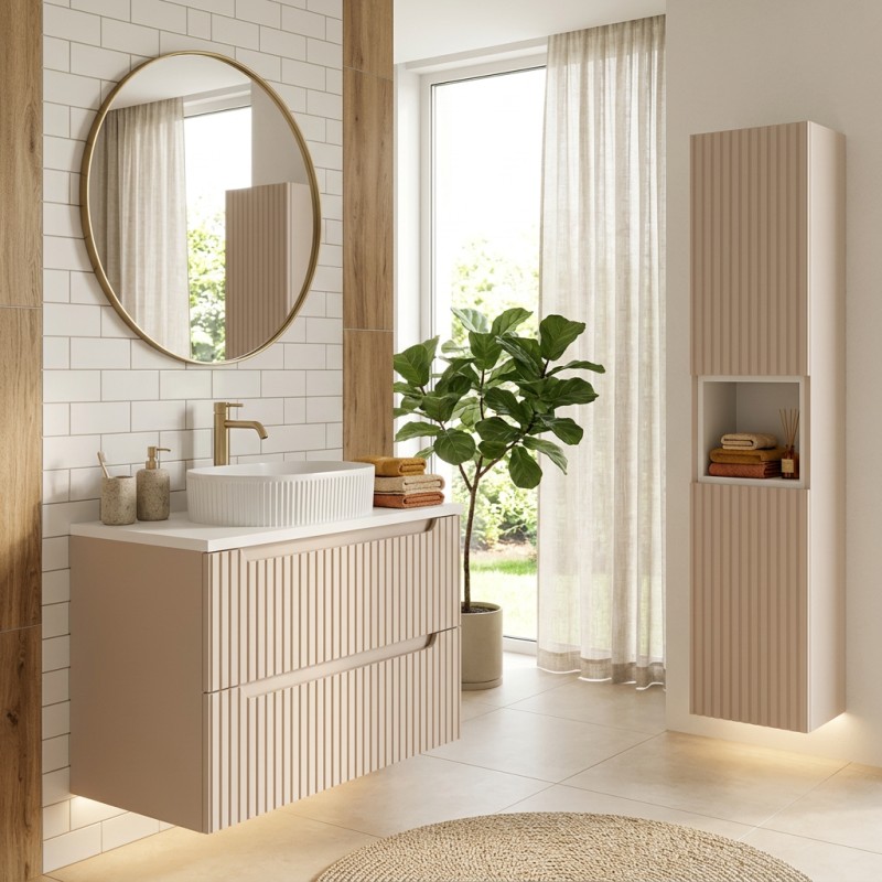 Le meuble sous vasque suspendu en coloris cachemire mat séduit par ses façades rainurées verticalement, apportant relief et modernité. Il est associé à un plan pour vasque blanc mat, créant un contraste lumineux et épuré parfaitement dans l’air du temps.
